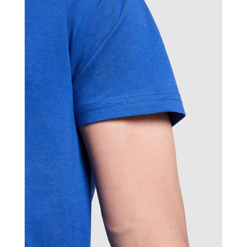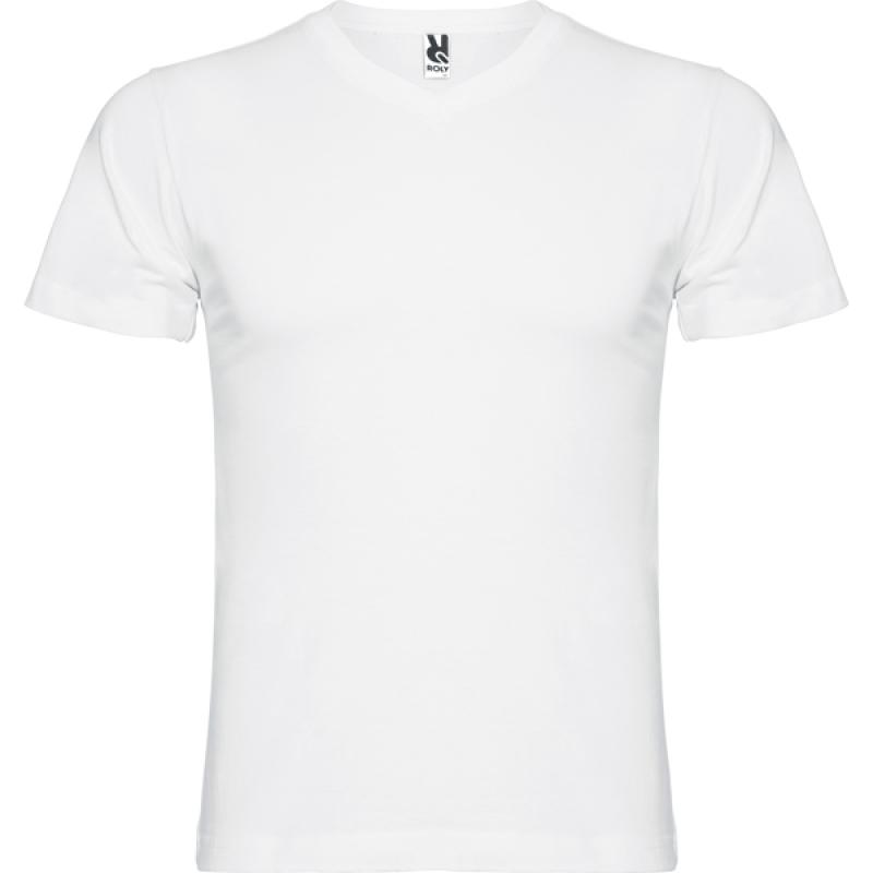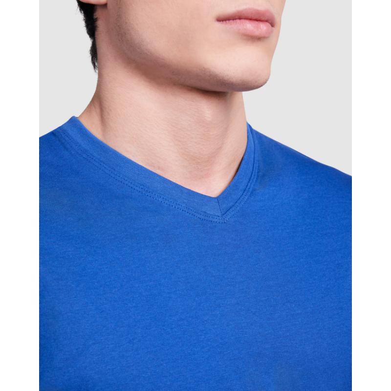 Camiseta de manga corta tubular. Cuello en pico en canalé 1x1. Cubrecosturas en cuello del mismo tejido.