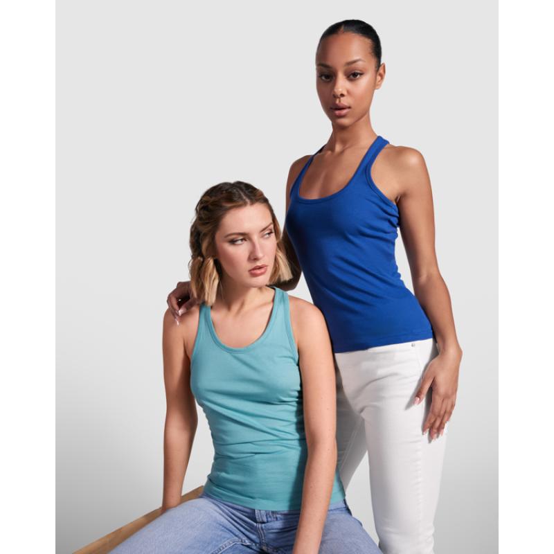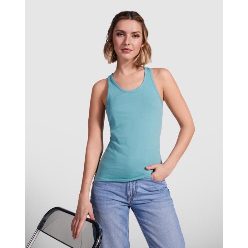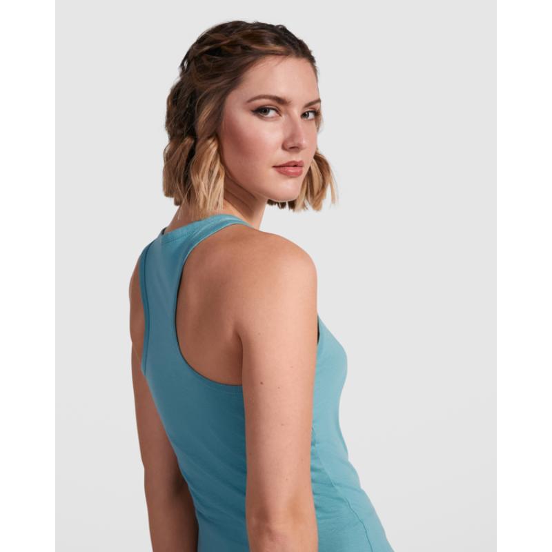 Camiseta de tirantes espalda nadadora entallada en cintura. Cuello con amplio escote redondo y sisas con ribete del mismo tejido.