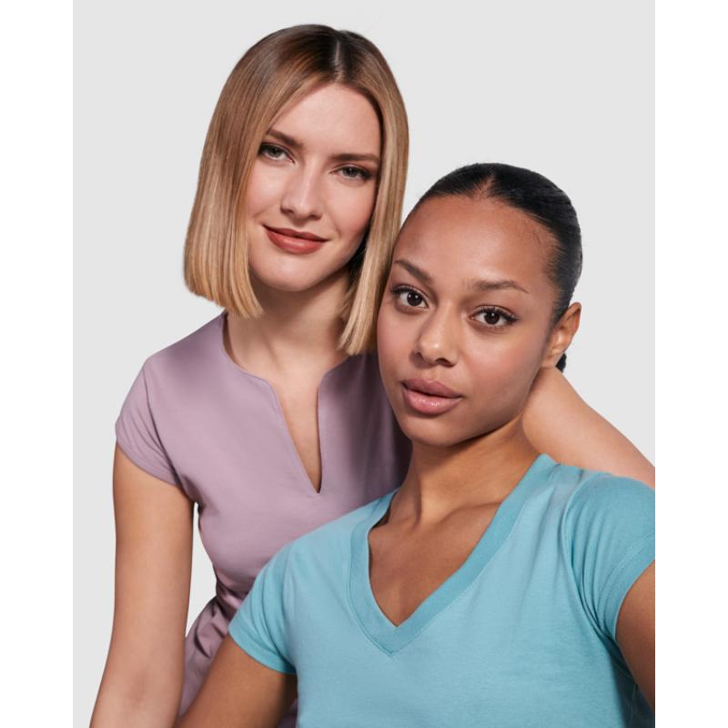 Camiseta de manga corta entallada en cintura. Cuello de pico en canalé 1x1. Cubrecosturas en cuello del mismo tejido.