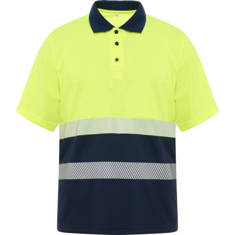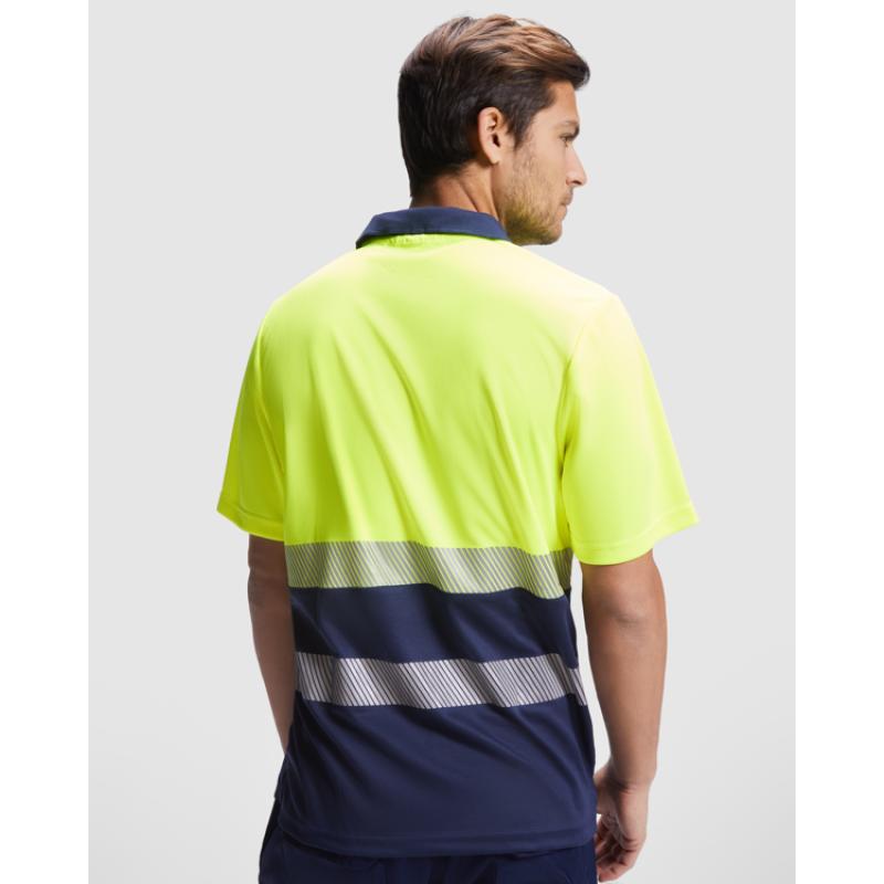 Polo manga corta bicolor de alta visibilidad. ·Tejido técnico transpirable. ·Dos bandas segmentadas en el cuerpo. ·Cuello en canalé 1x1.·Tapeta con 3 botones a contraste. ·Bolsillo opcional. ·Cubrecosturas en el cuello. ·Etiquetado Roly WRK exterior.·Ciclos de lavado: x25