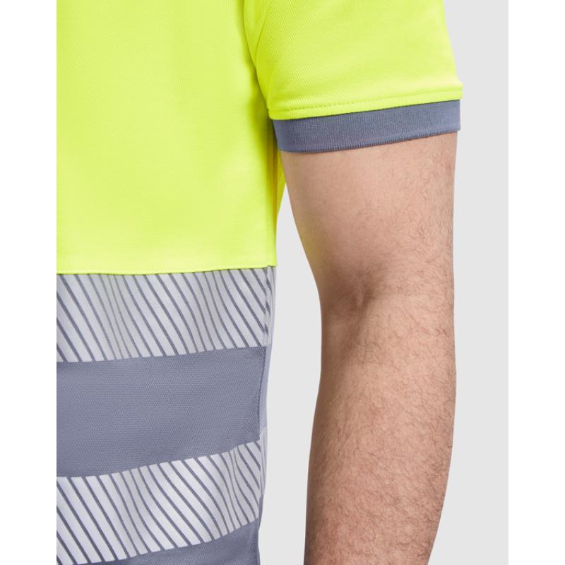 Polo manga corta alta visibilidad transpirable. ·Mezcla poliéster algodón tacto algodón. ·Dos bandas segmentadas en el cuerpo. ·Manga con puño y cuello en canalé 1x1. ·Tapeta con 3 botones a contraste. ·Bolsillo opcional. ·Cubrecosturas en el cuello. ·Opciones de color en liso y combinado. ·Etiquetado Roly WRK exterior.·Ciclos de lavado: x25