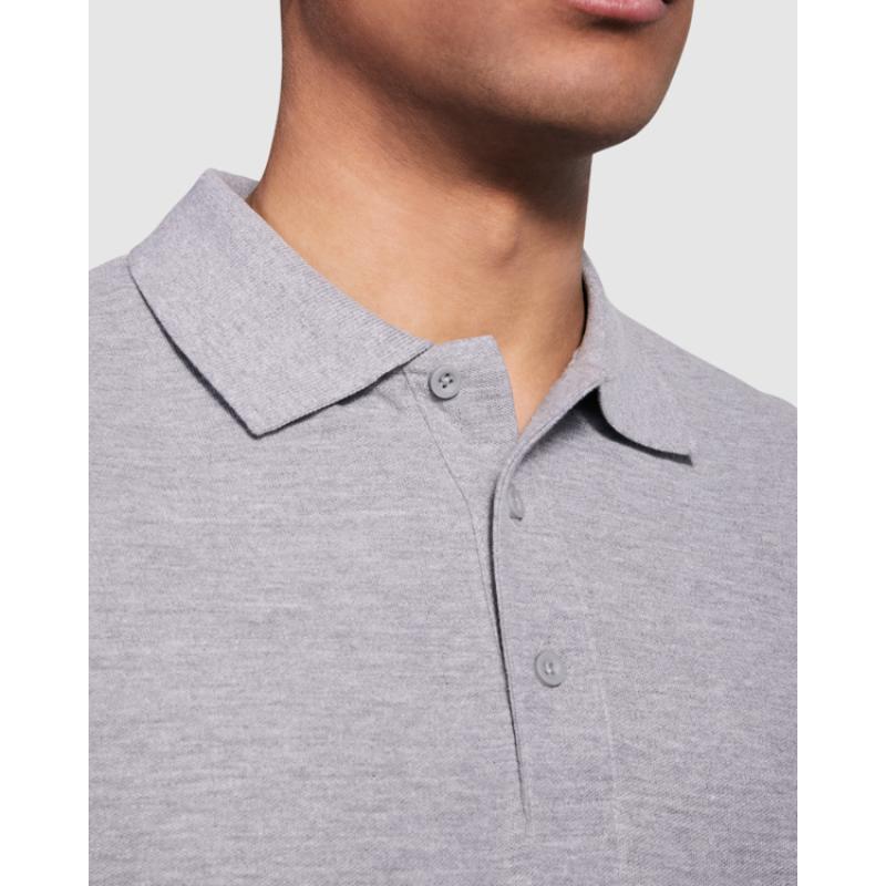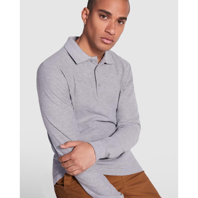 Polo de manga larga de algodón. Punto piqué. Cuello y puños tejidos 1x1. Tapeta de 3 botones. Cubrecosturas en cuello del mismo tejido. Bolsillo opcional.