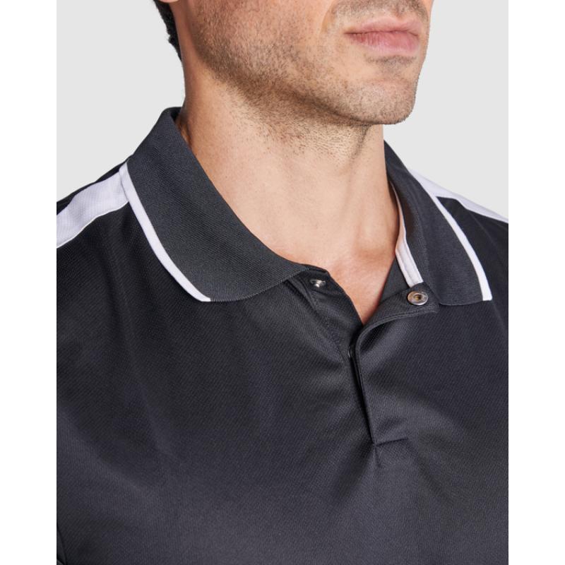 Polo técnico manga corta transpirable bicolor. Antibacteriano. Aperturas laterales. Pieza en hombros y bocamanga a contraste. Cuello y puños rib 1x1 al tono con detalle a contraste. Tapeta con botones a presión, uno visible a contraste de color y otro invisible dentro de la tapeta. Cubrecosturas del mismo tejido a contraste. Certificado GRS.