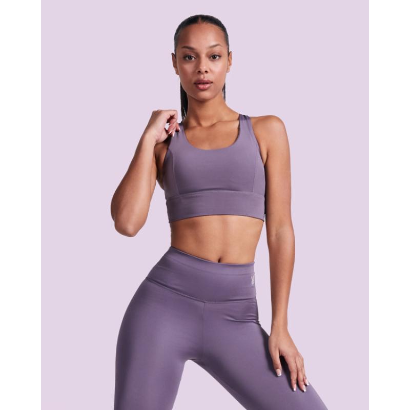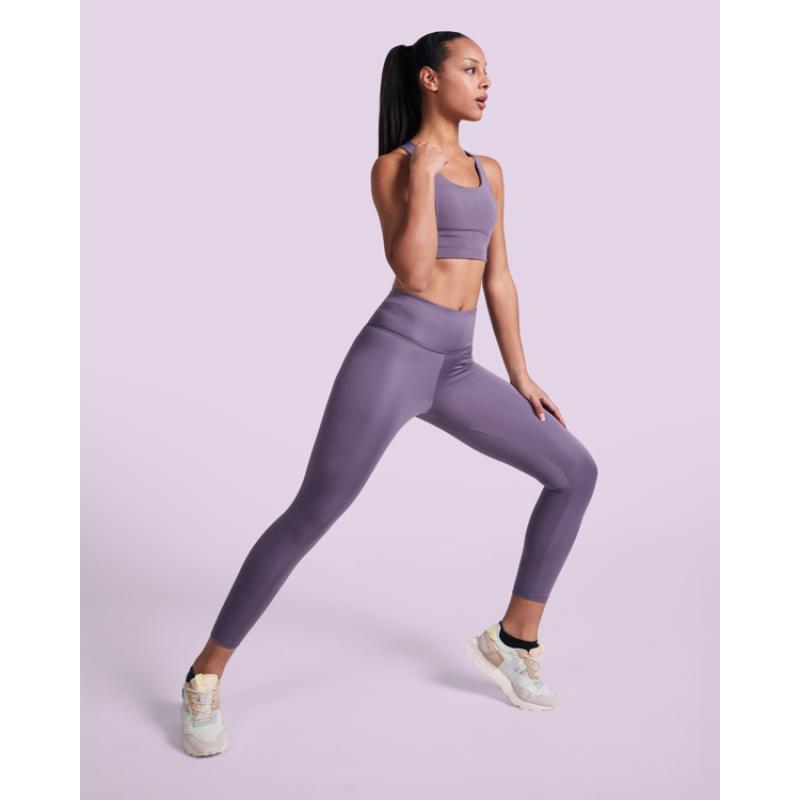 Top deportivo para mujer de alta sujeción. Tirantes entrelazados en espalda. Banda elástica de refuerzo en pieza bajo pecho. Doble tejido y forro. Copas de foam extraíbles. Logo Roly reflectante en la espalda.