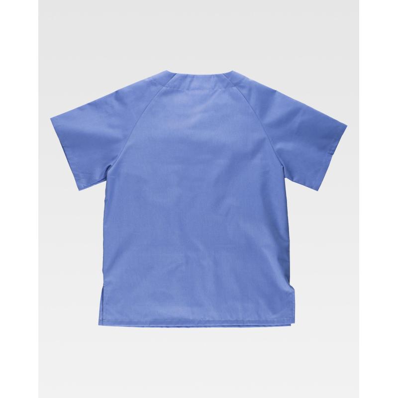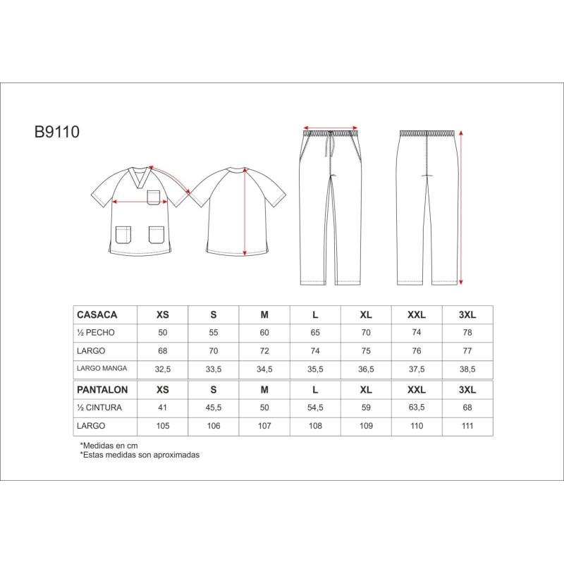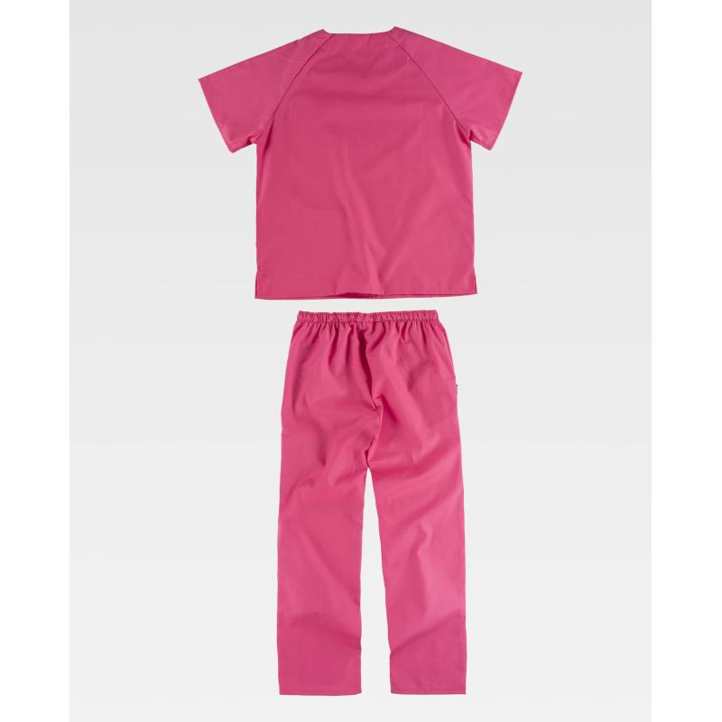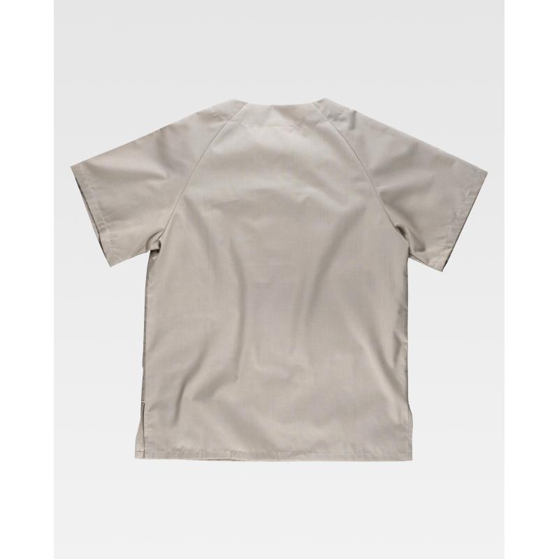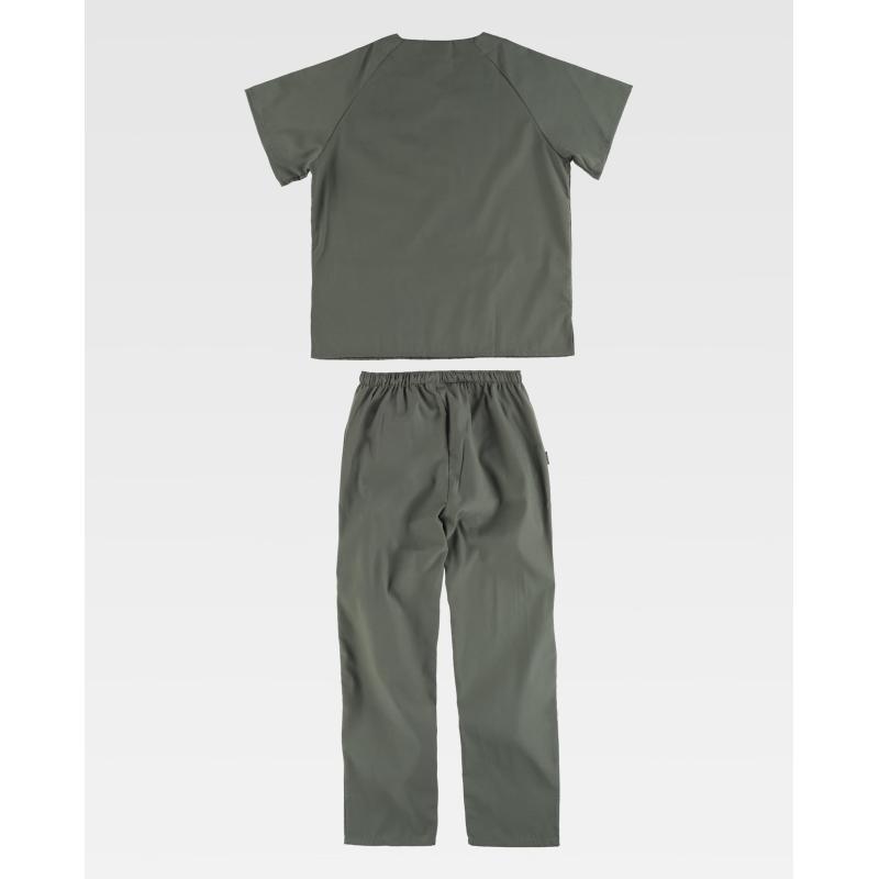 Conjunto unisex de casaca y pantalón: Casaca de manga corta. Cuello a pico. Aberturas laterales. Un bolsillo en pecho de plastón. Dos bolsillos laterales de plastón. Un bolsillo para bolígrafos. Pantalón con elástico y cordón en la cintura. Dos bolsillos laterales. 80% Poliéster 20% Algodón