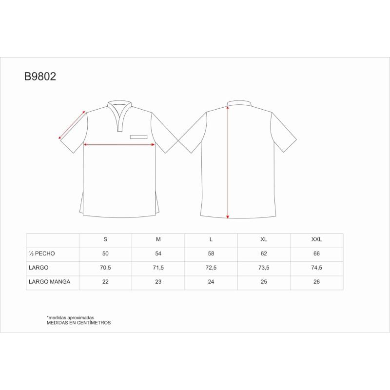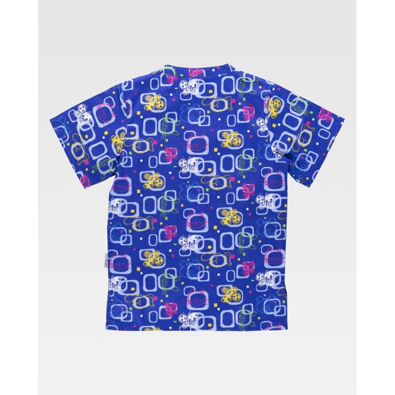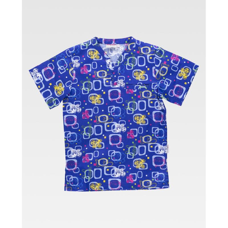 Casaca unisex de manga corta con estampado de mariposas y acabado antimanchas. Cuello cruzado de tirilla, un bolso de pecho de ojal. Aberturas en los costados. 65% Poliéster 35% Algodón