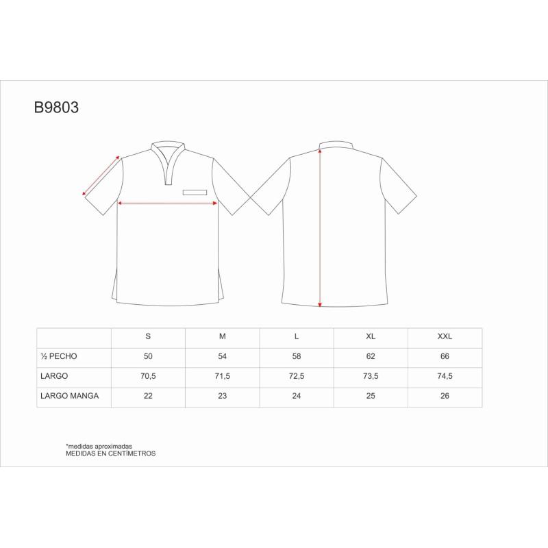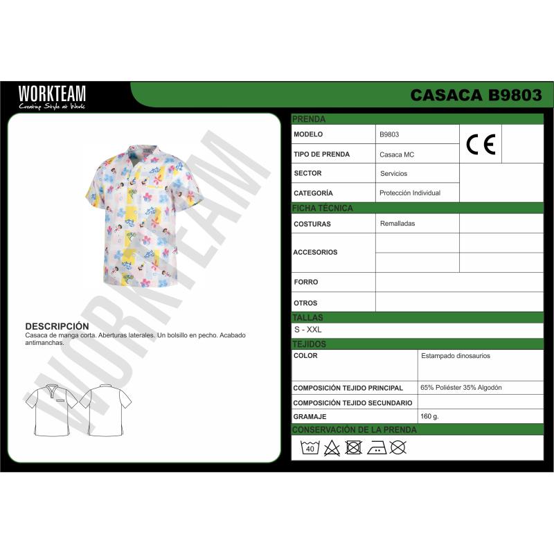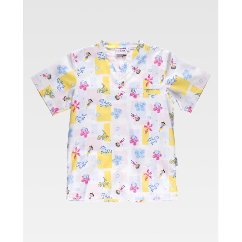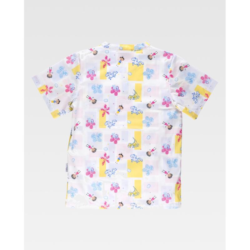 Casaca unisex de manga corta estampada con motivos infantiles y acabado antimanchas. Cuello cruzado de tirilla, un bolso de pecho de ojal. Aberturas en los costados. 65% Poliéster 35% Algodón