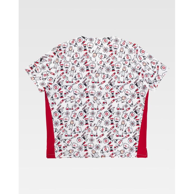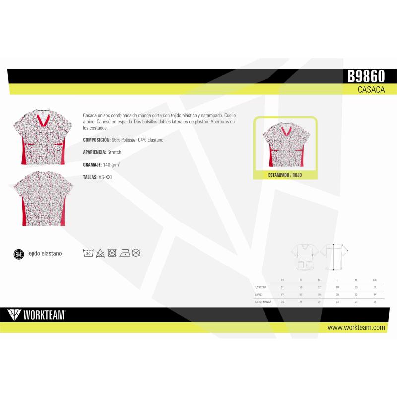 Casaca unisex combinada de manga corta con tejido elástico y estampado. Cuello a pico. Canesú en espalda. Dos bolsillos dobles laterales de plastón. Aberturas en los costados. 96% Poliéster 4% Elastano