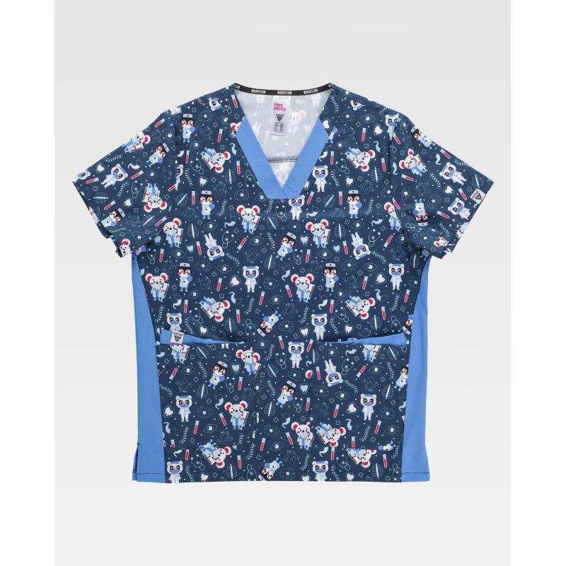 Casaca unisex combinada de manga corta con tejido elástico y estampado. Cuello a pico. Canesú en espalda. Dos bolsillos dobles laterales de plastón. Aberturas en los costados. 96% Poliéster 4% Elastano