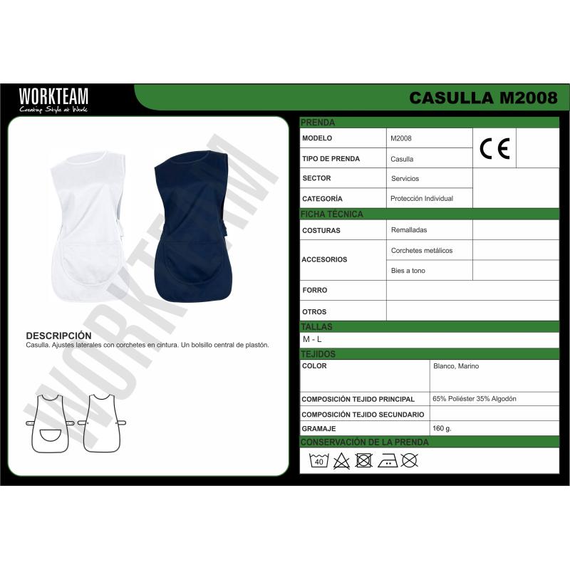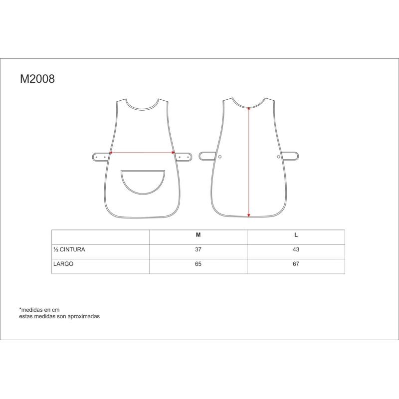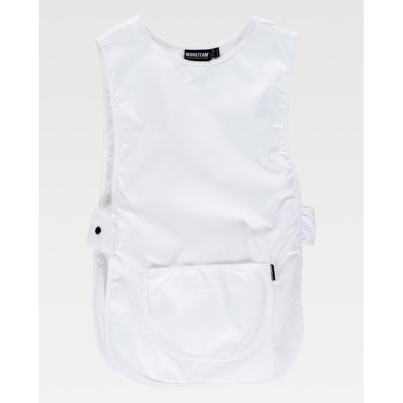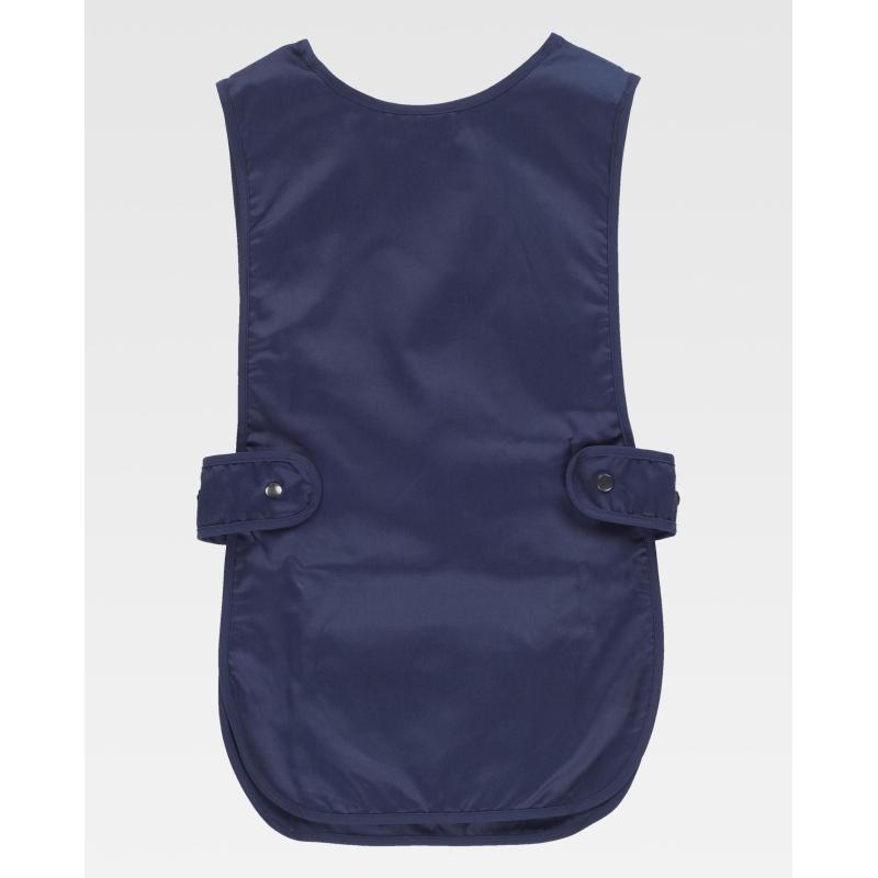 Casulla corta de cuello redondo. Piezas laterales ajustables con doble corchete en la cintura. Un bolso central redondeado. Ribeteado con bies al tono. 65% Poliéster 35% Algodón