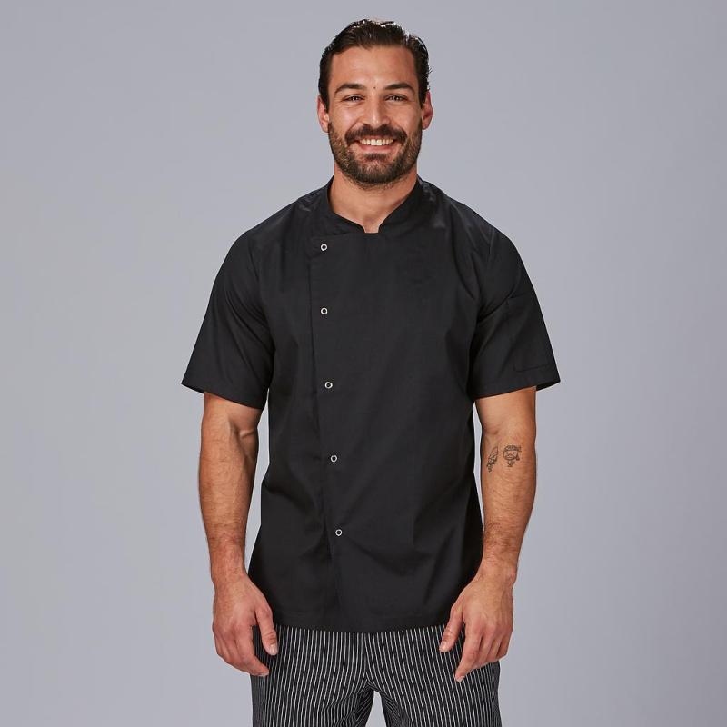 El diseño de cuello mao y el cierre cruzado mediante botones de presión vistos aportan un toque elegante y profesional a la chaqueta, lo que garantiza que el personal de hostelería luzca impecable y representativo en todo momento.