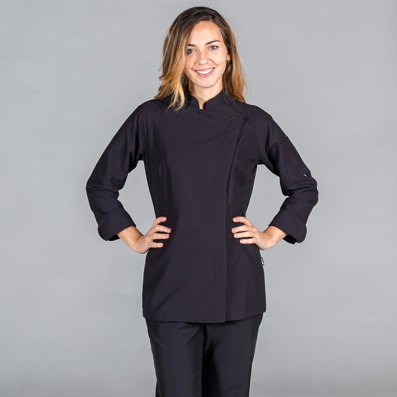 La chaqueta de cocina mujer IZA presenta un diseño elegante con mangas largas y cierre cruzado mediante botones de presión ocultos. Esto no solo añade un toque de sofisticación a la prenda, sino que también facilita la preparación para el trabajo en la cocina.
