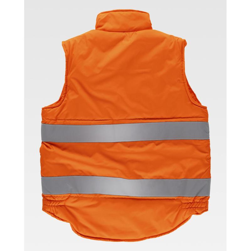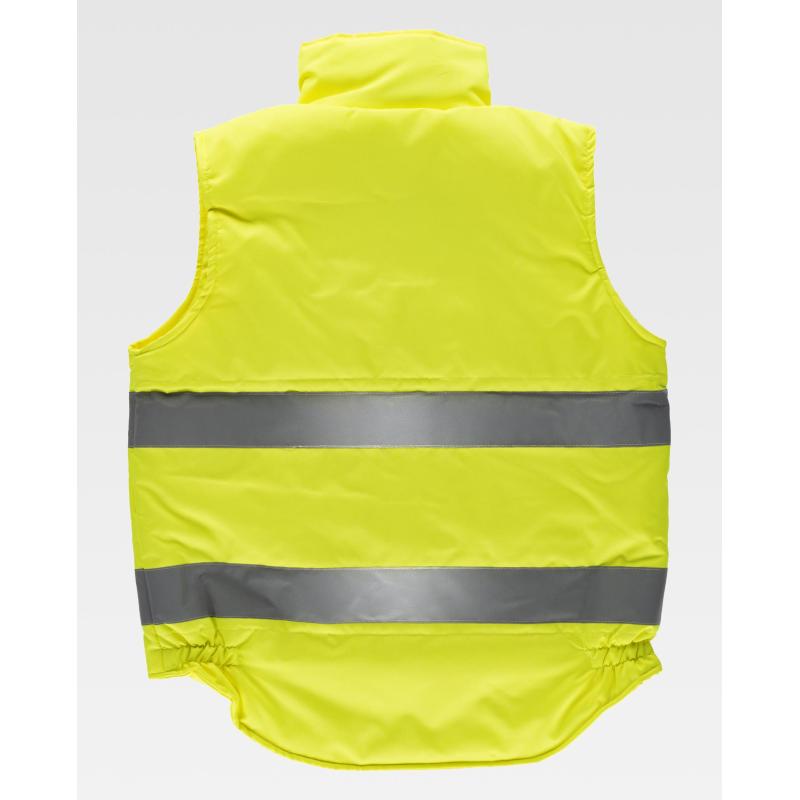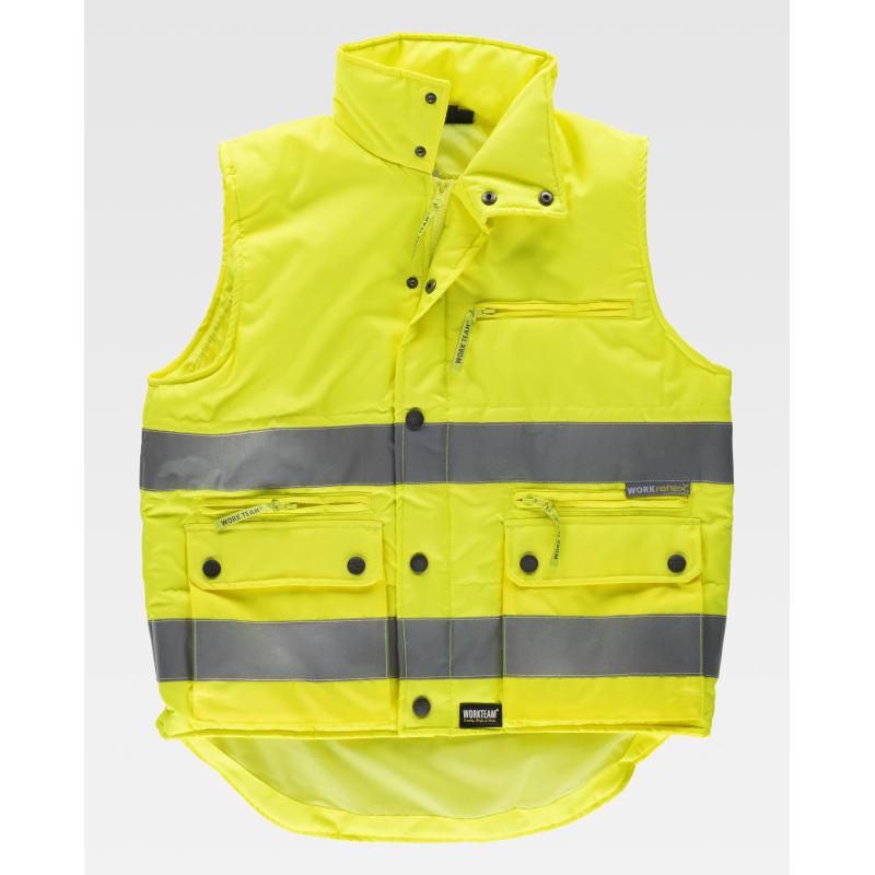 Chaleco acolchado de alta visibilidad en tejido Oxford con cintas reflectantes. Cuello alto y cierre de cremallera oculta por solapa de corchetes. Un bolso de pecho y dos laterales interiores con cierre de cremallera. Dos bolsos con fuelle y cartera de corchetes en los costados. Un bolso de pecho de plastón con cierre de velcro en el interior. Dos cintas reflectantes en pecho y espalda. Sisas ajustables. Elástico en los laterales de la cintura. 100% Poliéster