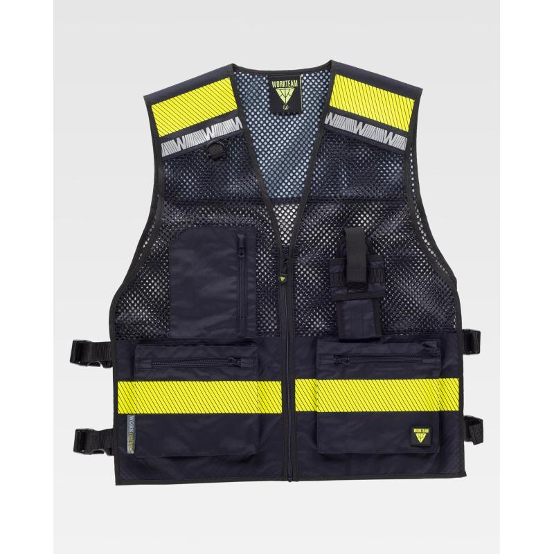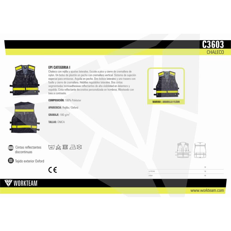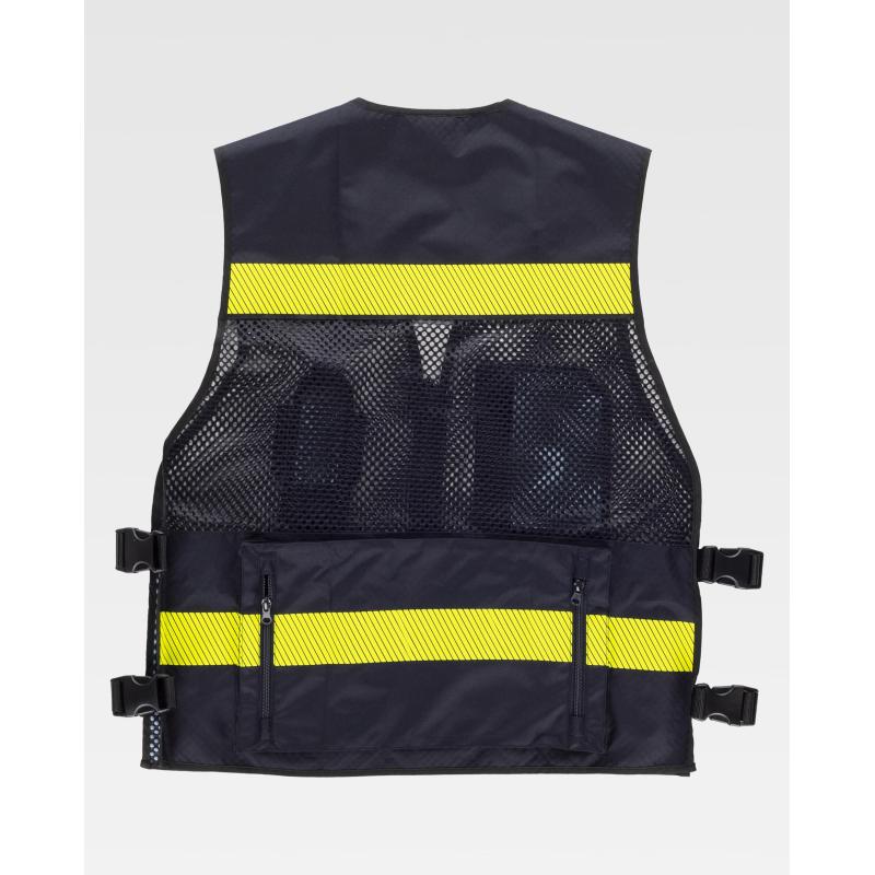 Chaleco con rejilla y ajustes laterales. Escote a pico y cierre de cremallera de nylon. Un bolso de plastón en pecho con cremallera vertical. Sistema de sujeción especial para emisoras. Argolla en pecho. Dos bolsos laterales y uno trasero con fuelle y cierre de cremallera. Hebillas regulables laterales. Dos cintas segmentadas termoadhesivas reflectantes de alta visibilidad en delantero y espalda. Cinta reflectante decorativa personalizada en hombros. Ribeteado con bies a contraste. 100% Poliéster