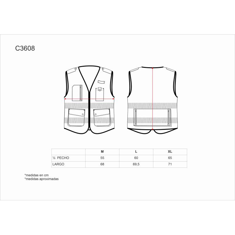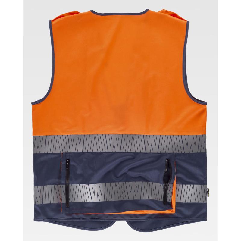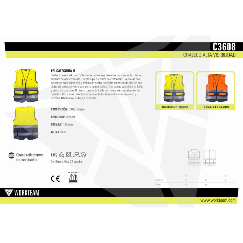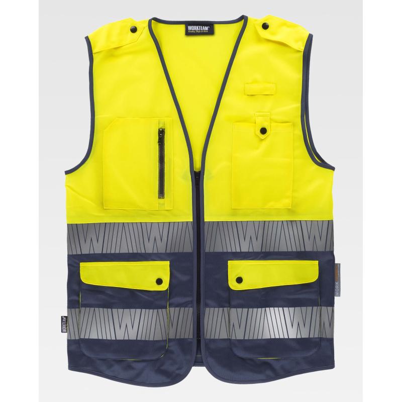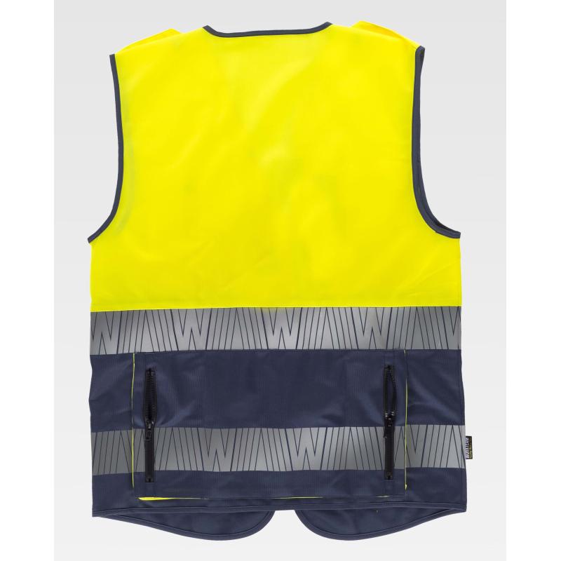 Chaleco combinado con cintas reflectantes segmentadas personalizadas. Parte superior de alta visibilidad. Escote a pico y cierre de cremallera. Galoneras con corchetes en los hombros y trabilla en pecho. Un bolso en pecho de plastón con cierre de corchete y otro con cierre de cremallera. Dos bolsos laterales con fuelle y cierre de corchete. Un bolso trasero de fuelle con cierre de cremallera en los laterales. Dos cintas reflectantes segmentadas termoadhesivas en pecho y espalda. Ribeteado con bies a contraste. 100% Poliéster