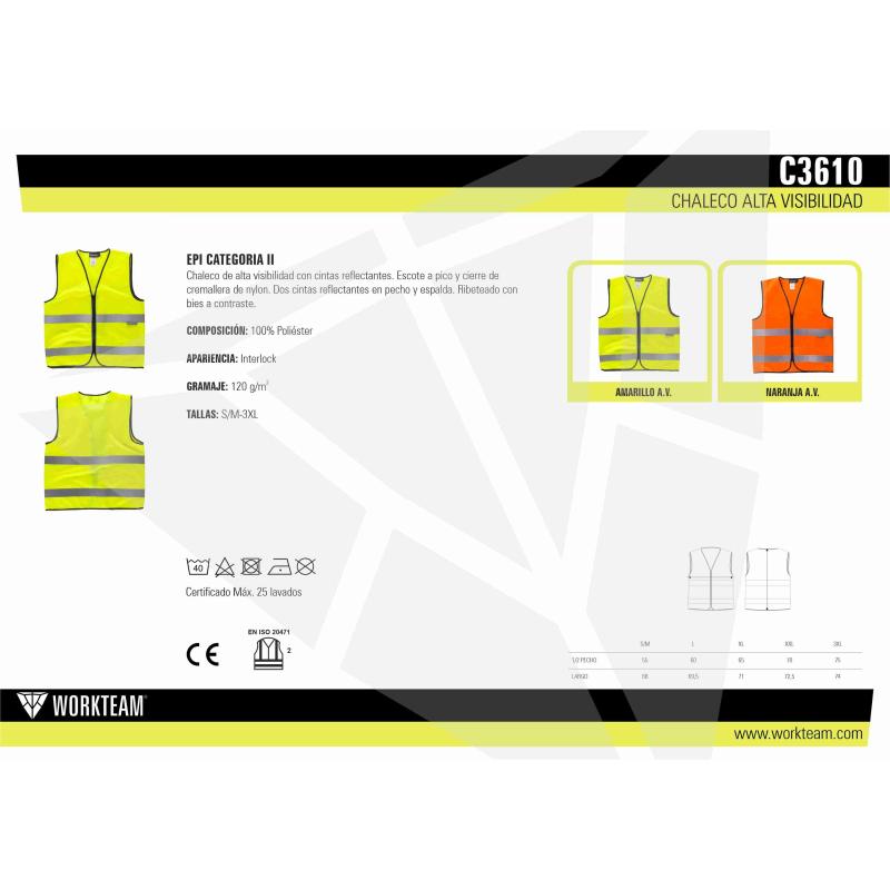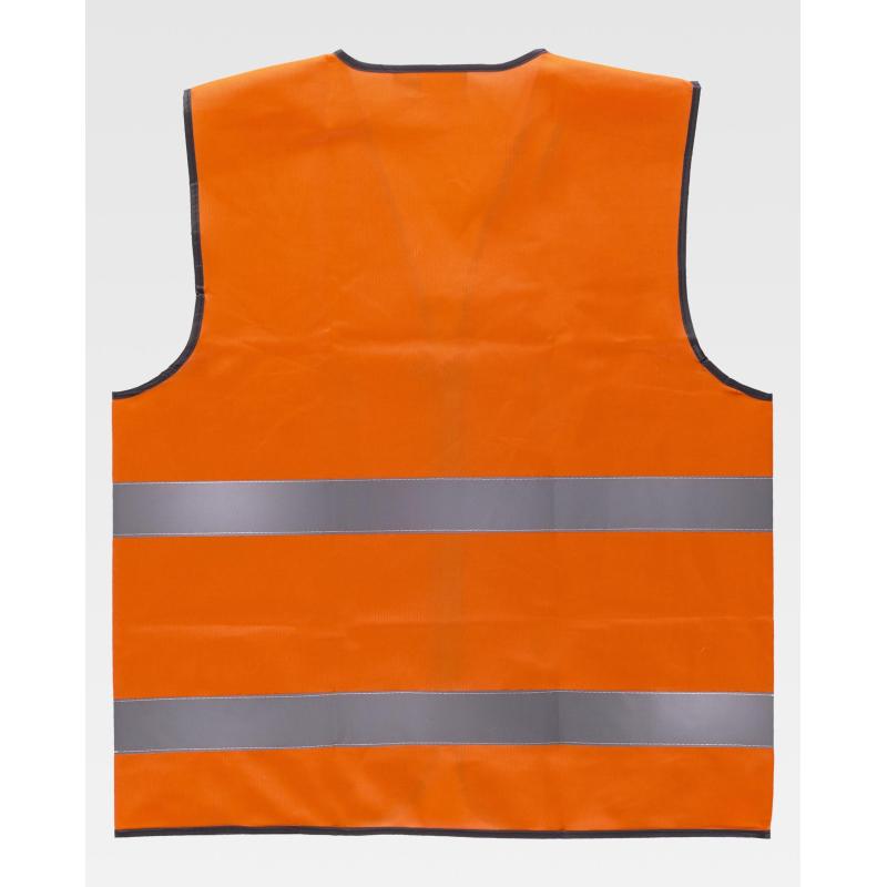 Chaleco de alta visibilidad con cintas reflectantes. Escote a pico y cierre de cremallera de nylon. Dos cintas reflectantes en pecho y espalda. Ribeteado con bies a contraste. 100% Poliéster