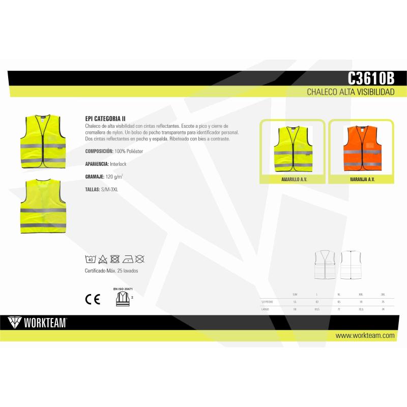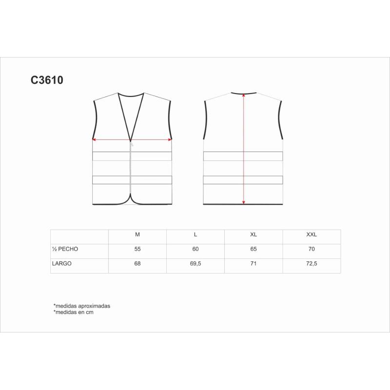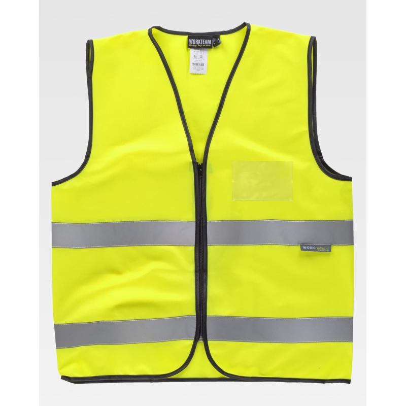 Chaleco de alta visibilidad con cintas reflectantes. Escote a pico y cierre de cremallera de nylon. Un bolso de pecho transparente para identificador personal. Dos cintas reflectantes en pecho y espalda. Ribeteado con bies a contraste. 100% Poliéster