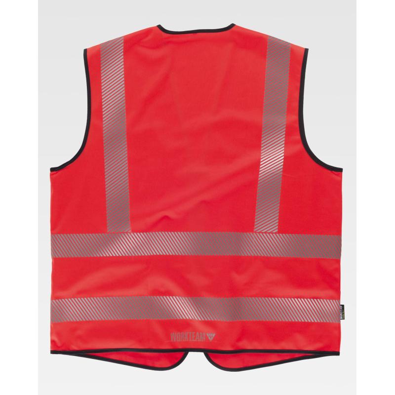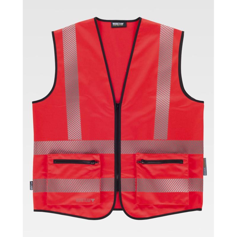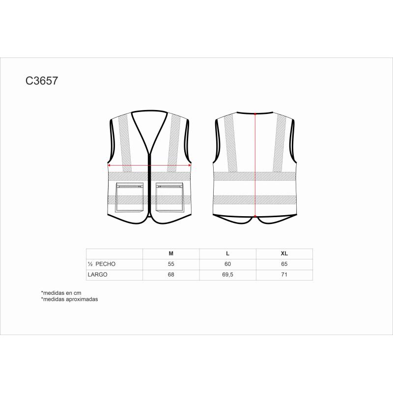 Chaleco de alta visibilidad con cintas reflectantes segmentadas. Escote a pico y cierre de cremallera. Dos bolsos laterales con fuelle y cierre de cremallera. Una cinta reflectante segmentada termoadhesiva en hombros y dos en pecho y espalda. Ribeteado con bies a contraste. 100% Poliéster
