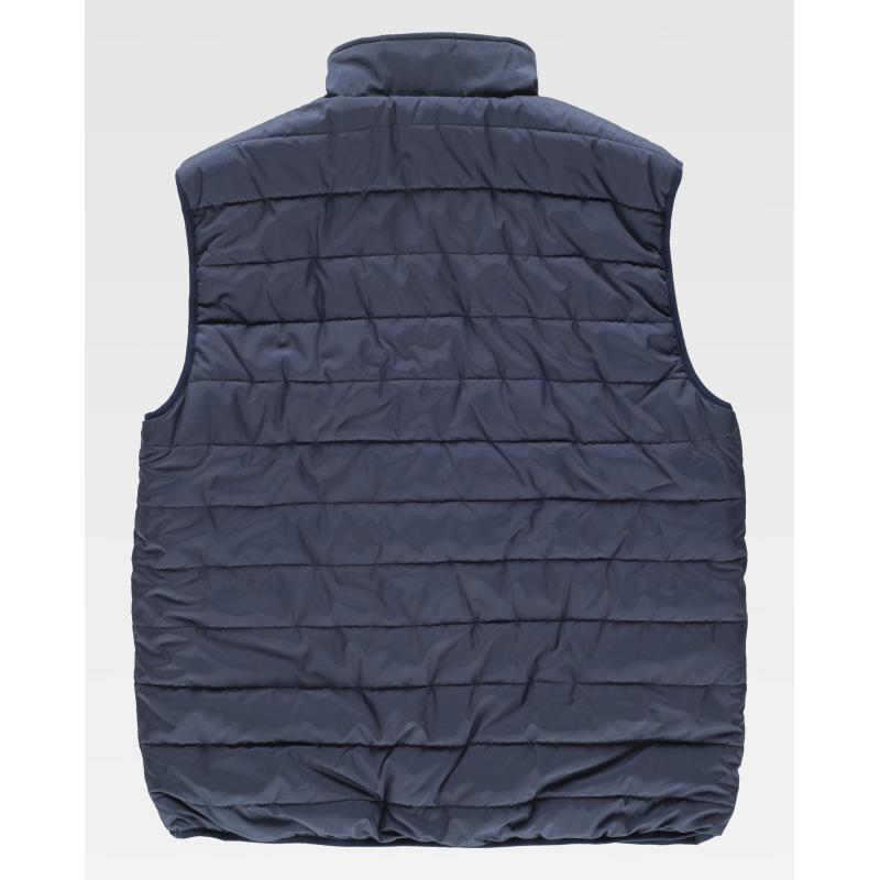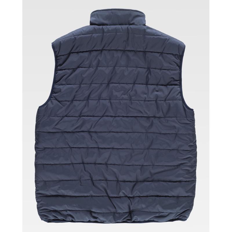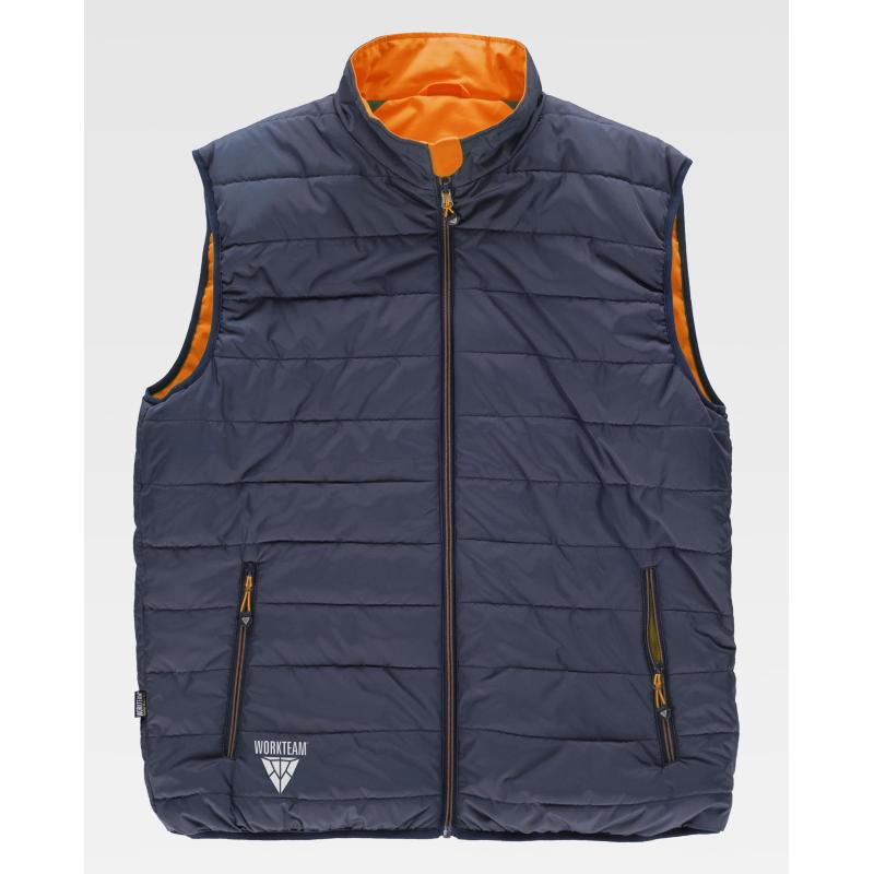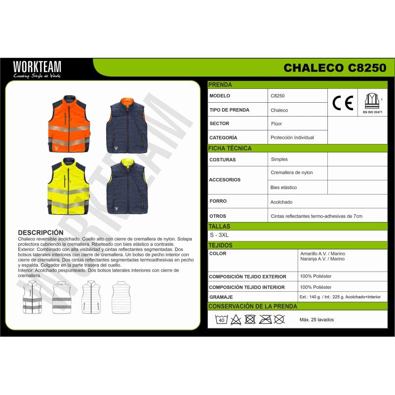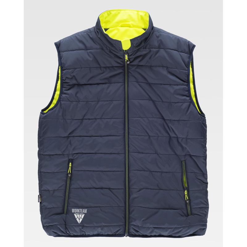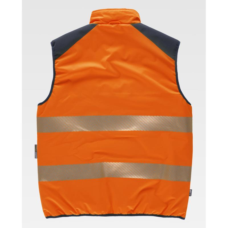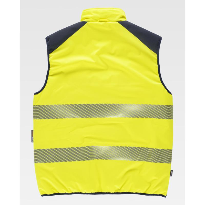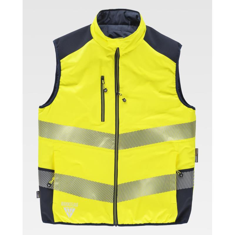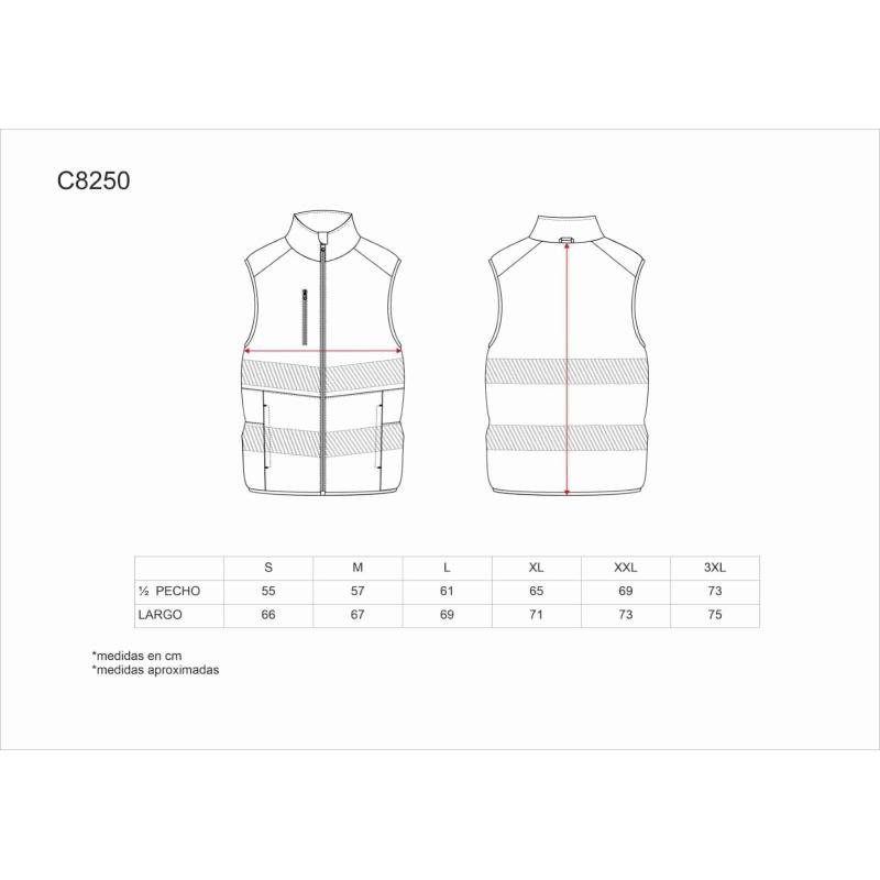 Chaleco reversible acolchado. Cuello alto con cierre de cremallera de nylon. Solapa protectora cubriendo la cremallera. Ribeteado con bies elástico a contraste. Exterior: Combinado con alta visibilidad y cintas reflectantes segmentadas. Dos bolsos laterales interiores con cierre de cremallera. Un bolso de pecho interior con cierre de cremallera. Dos cintas reflectantes segmentadas termoadhesivas en pecho y espalda. Colgador en la parte trasera del cuello. Interior: Acolchado pespunteado. Dos bolsos laterales interiores con cierre de cremallera. 100% Poliéster