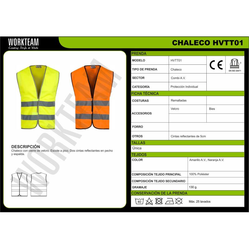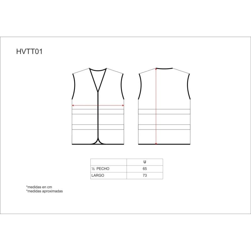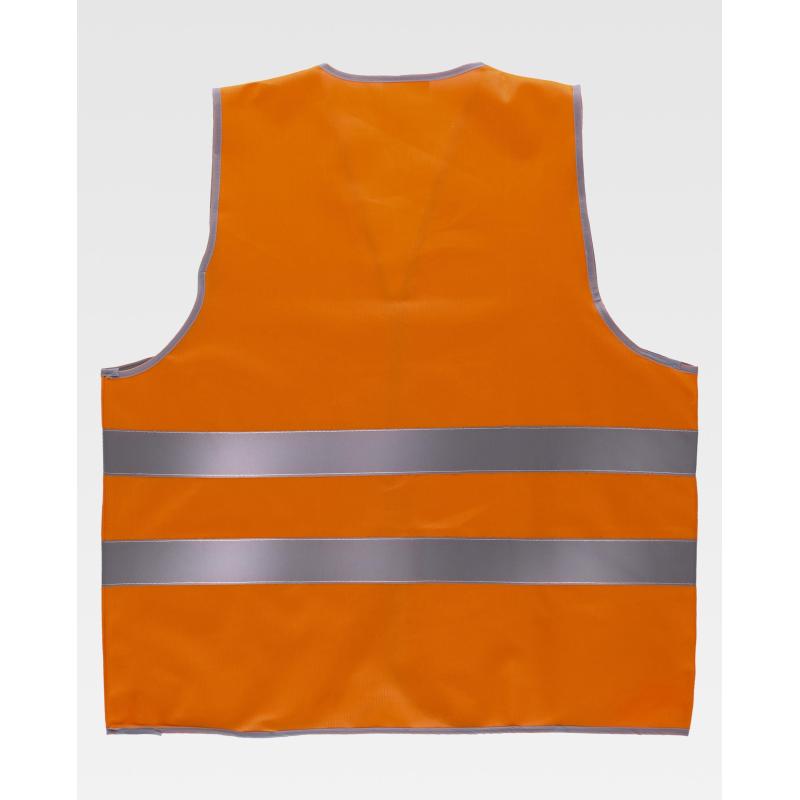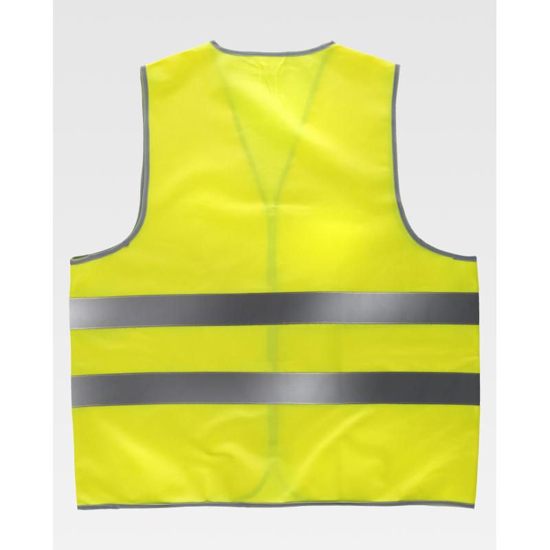 Chaleco de alta visibilidad con cintas reflectantes. Escote a pico y cierre de velcro adaptable. Dos cintas reflectantes en pecho y espalda. Ribeteado con bies a contraste. 100% Poliéster