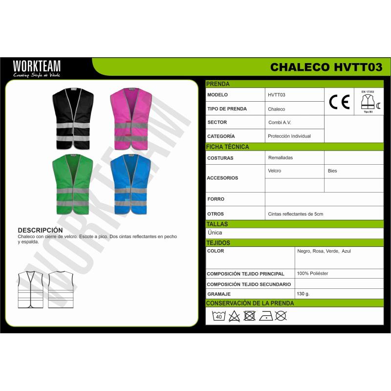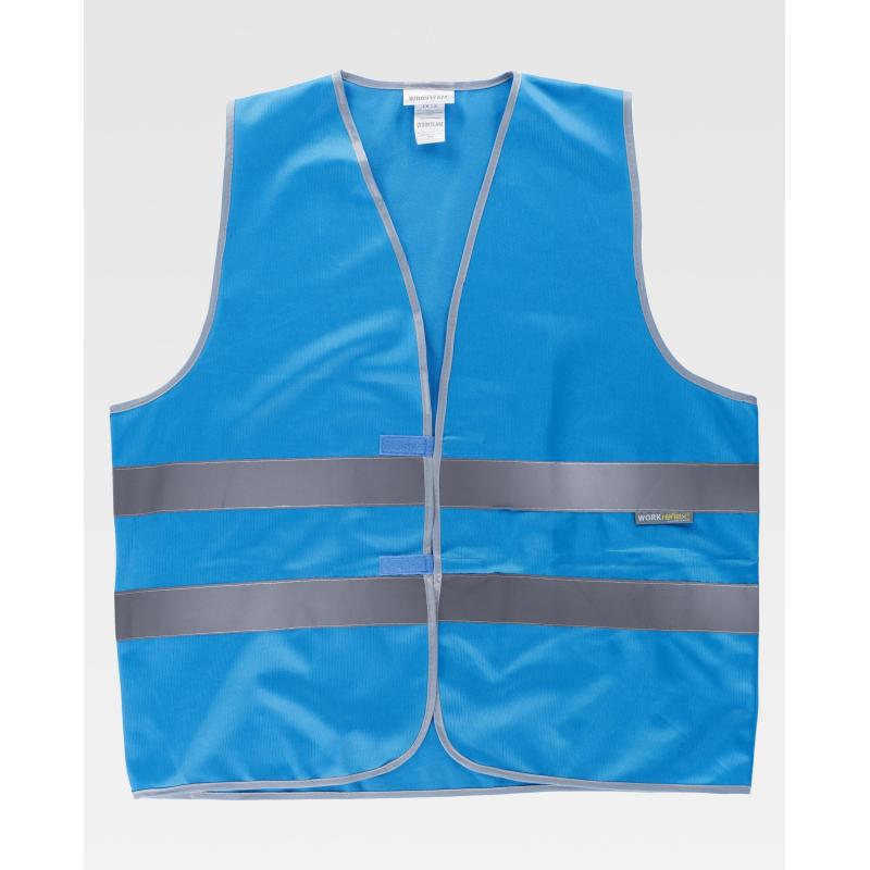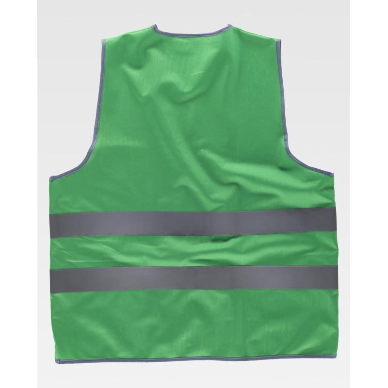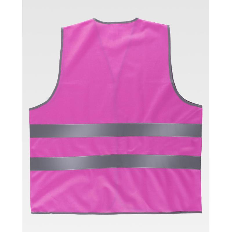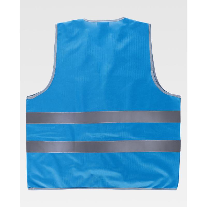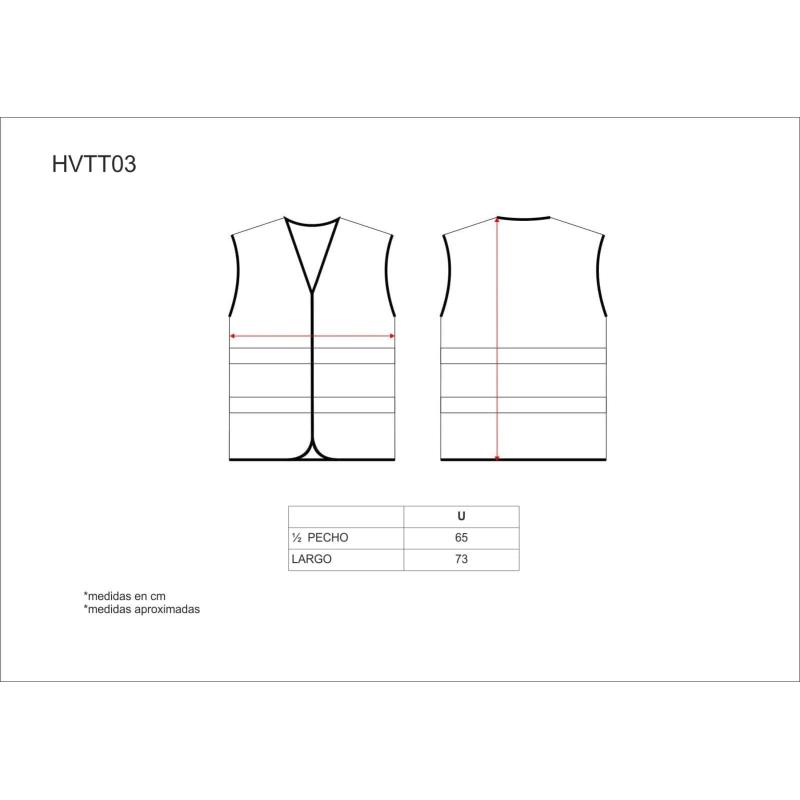Chaleco de visibilidad realzada con cintas reflectantes. Escote a pico y cierre de velcro adaptable. Dos cintas reflectantes en pecho y espalda. Ribeteado con bies a contraste. 100% Poliéster