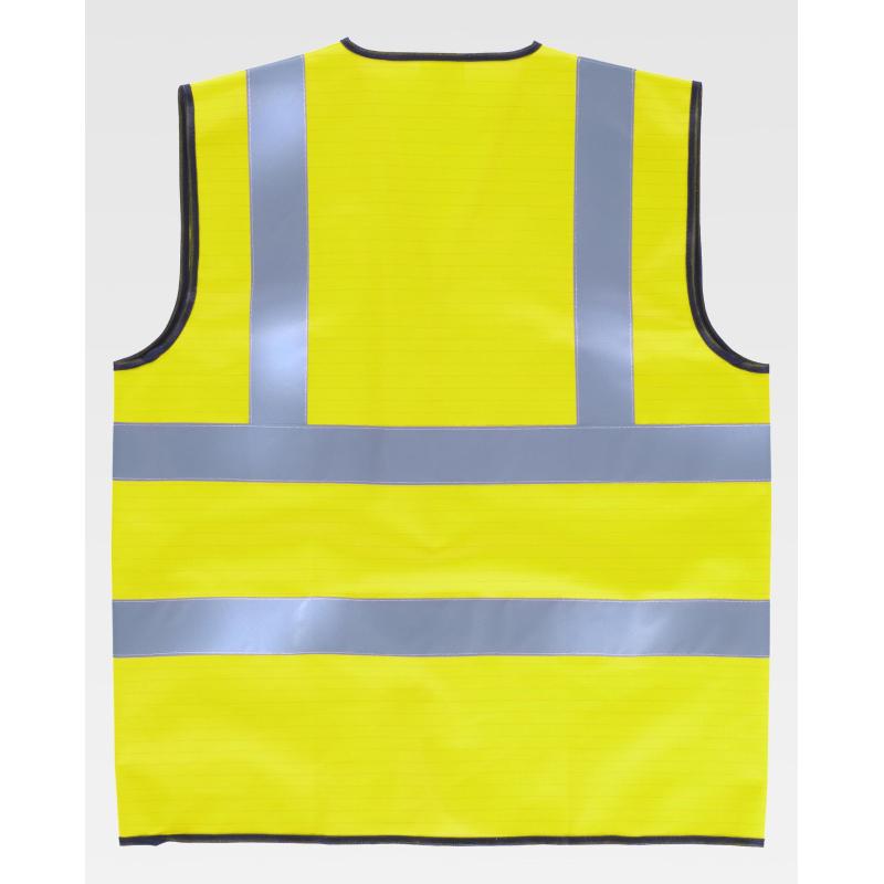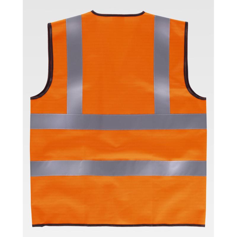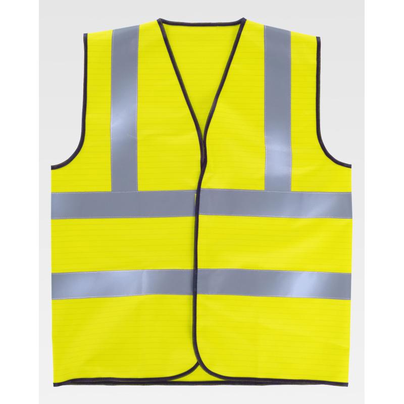 Chaleco ESD de alta visibilidad con cintas reflectantes. Escote a pico y cierre de velcro adaptable. Una cinta reflectante en hombros y dos en pecho y espalda. Ribeteado con bies a contraste. La separación entre los hilos conductores de este tejido ayuda a disipar la carga electrostática acumulada, evitando la formación de chispas que puedan provocar un incendio. 98% Algodón 2% Fibra antiestática