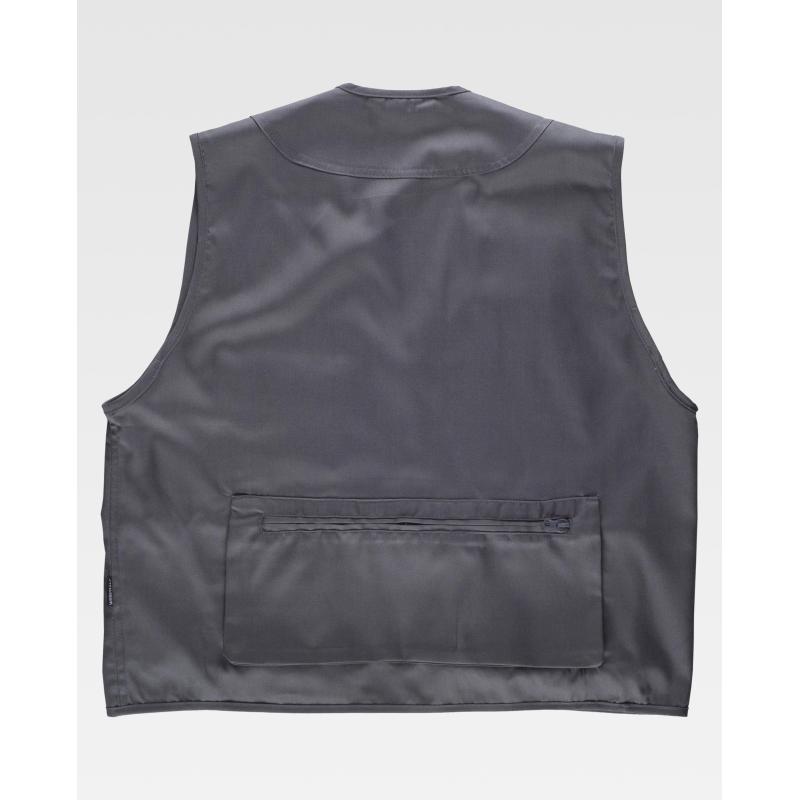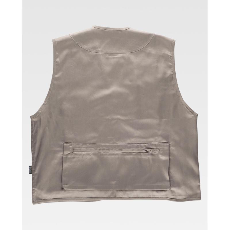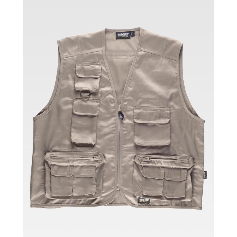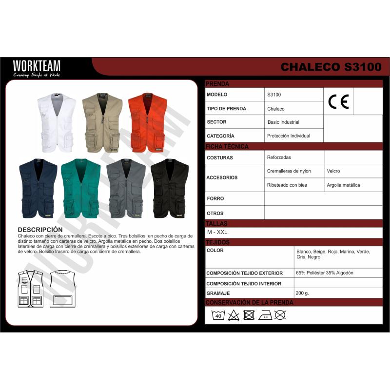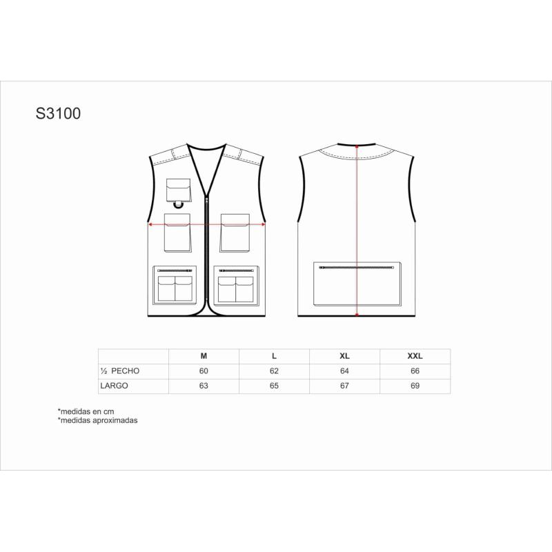 Chaleco tipo safari con cierre de cremallera de nylon. Escote a pico. Tres bolsos de pecho de distinto tamaño con fuelle y cartera de velcro. Argolla metálica en el bolsillo superior. Dos bolsos laterales con fuelle y cierre de cremallera en los costados. Bolsillos auxiliares superpuestos con cartera de velcro. Bolso trasero con fuelle y cierre de cremallera. Ribeteado con bies. 65% Poliéster 35% Algodón