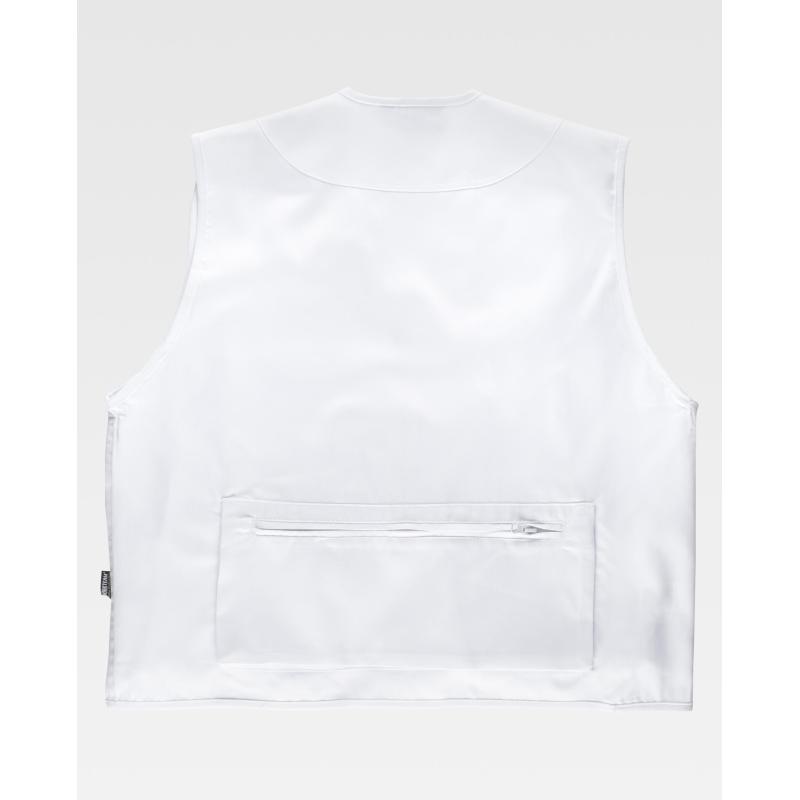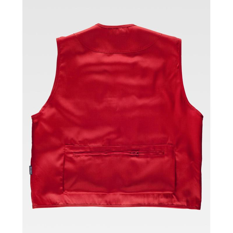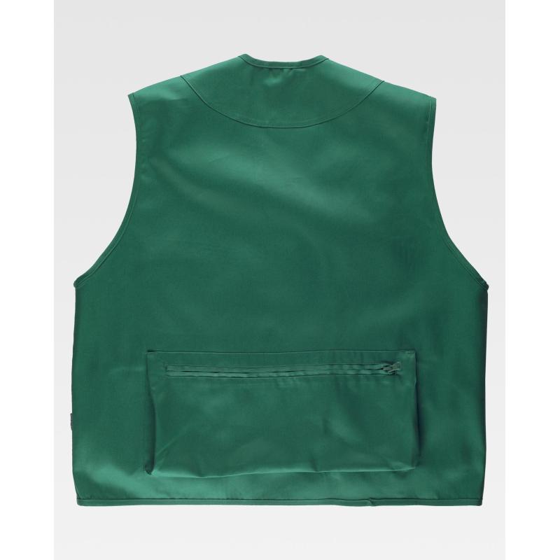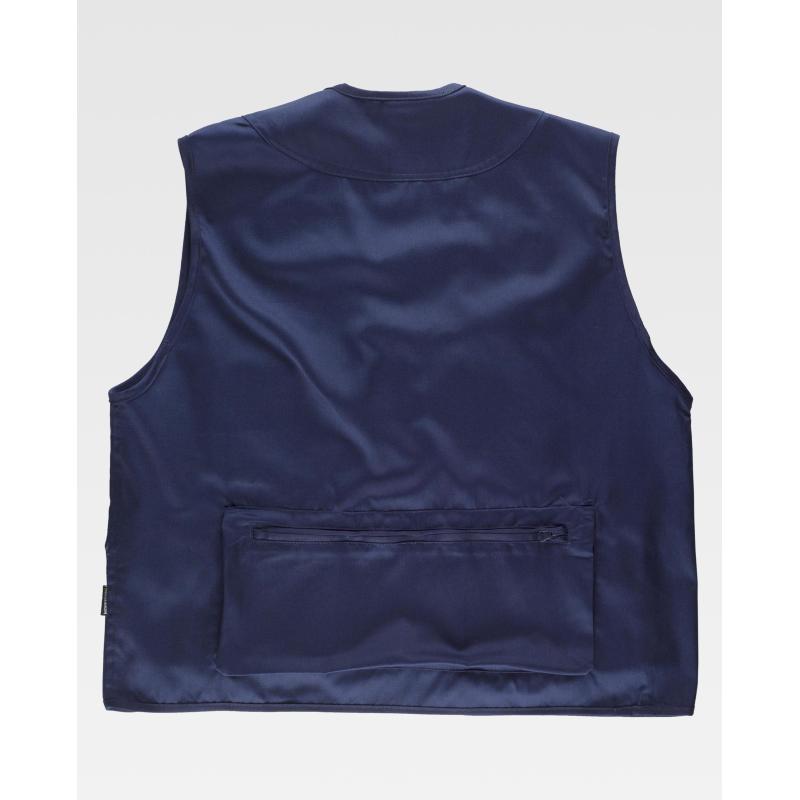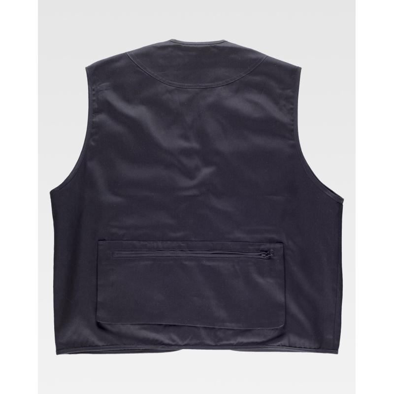 Chaleco tipo safari con cierre de cremallera de nylon. Escote a pico. Tres bolsos de pecho de distinto tamaño con fuelle y cartera de velcro. Argolla metálica en el bolsillo superior. Dos bolsos laterales con fuelle y cierre de cremallera en los costados. Bolsillos auxiliares superpuestos con cartera de velcro. Bolso trasero con fuelle y cierre de cremallera. Ribeteado con bies. 65% Poliéster 35% Algodón
