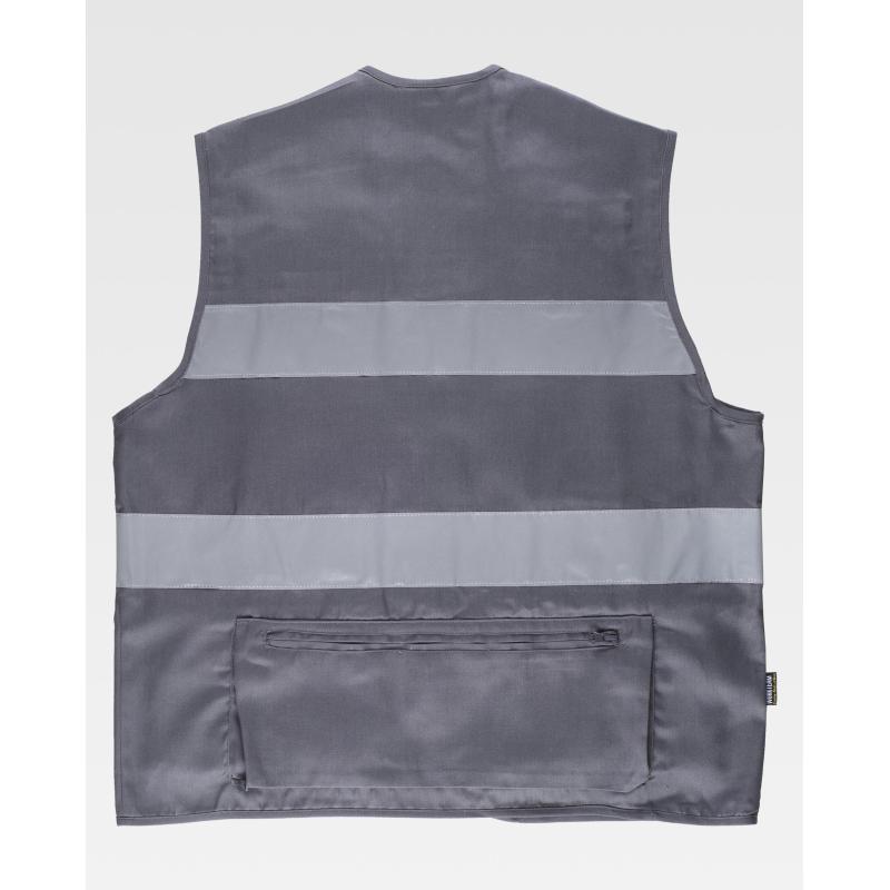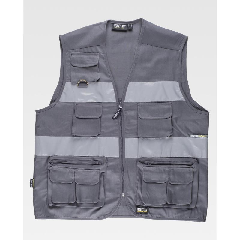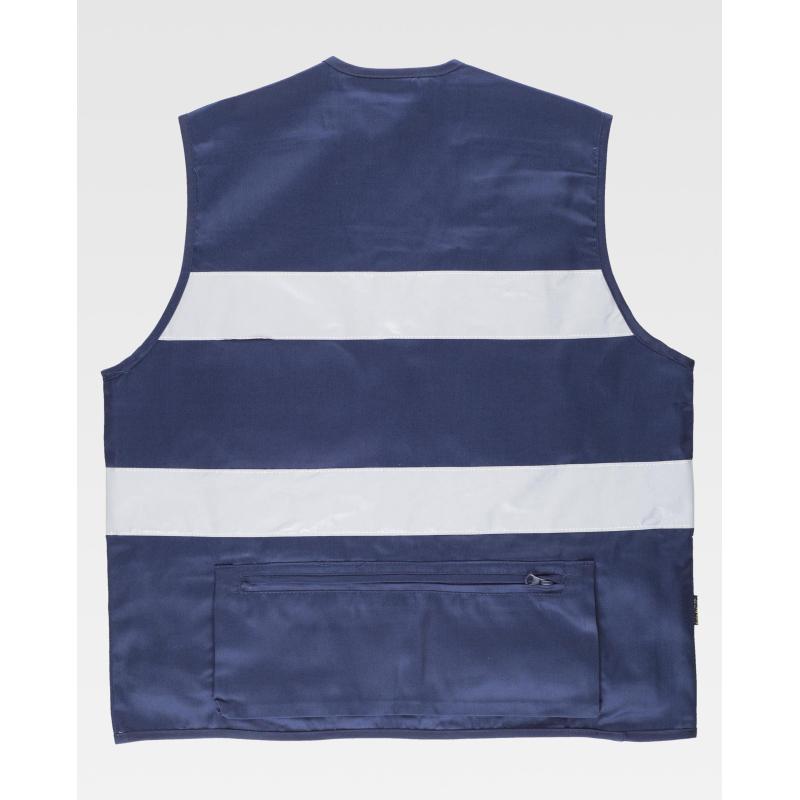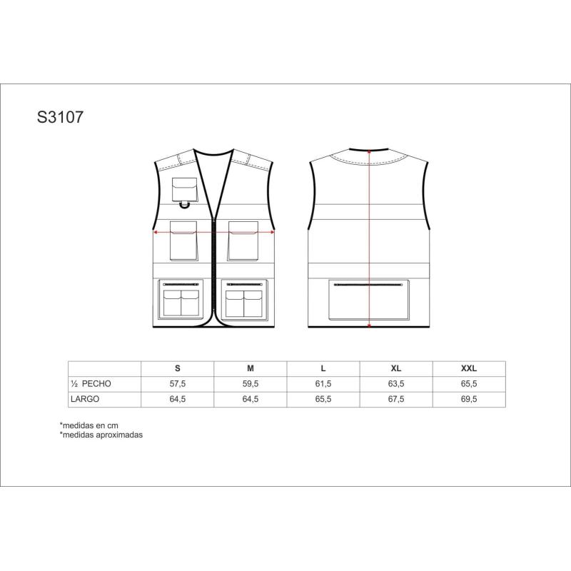 Chaleco tipo safari con cintas reflectantes. Escote a pico y cierre de cremallera de nylon. Tres bolsos de pecho de distinto tamaño con fuelle y cartera de velcro. Argolla metálica en el bolsillo superior. Dos bolsos laterales con fuelle y cierre de cremallera en los costados. Bolsillos auxiliares superpuestos con cartera de velcro. Bolso trasero con fuelle y cierre de cremallera. Dos cintas reflectantes en pecho y espalda. Ribeteado con bies. 65% Poliéster 35% Algodón