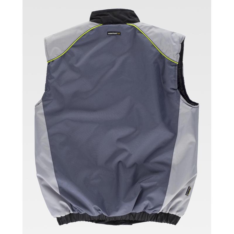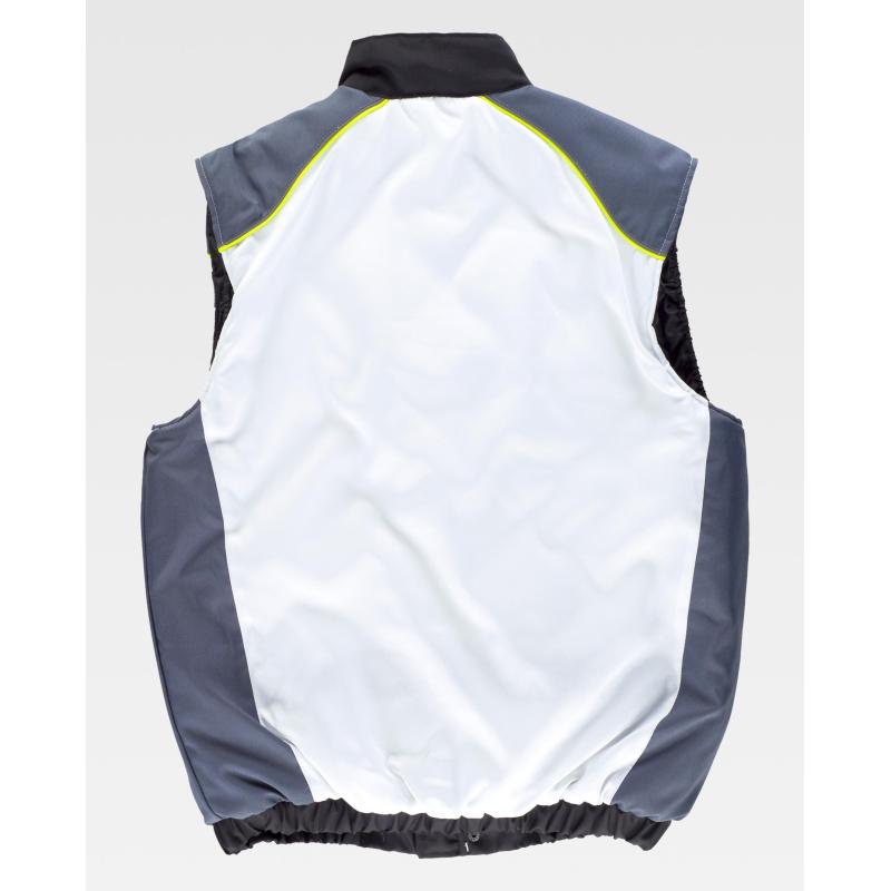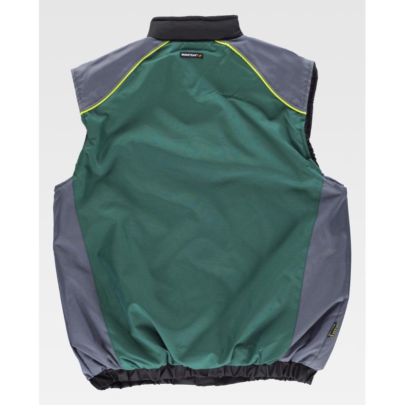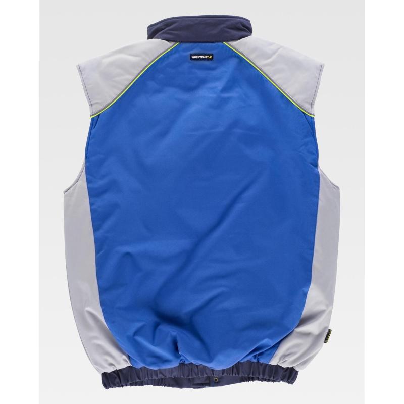 Chaleco acolchado tricolor en tejido Oxford con vivos de alta visibilidad. Cuello alto y cierre de cremallera y corchetes ocultos por solapa postiza. Dos bolsos de pecho interiores con cartera de velcro. Dos bolsos laterales interiores con cremallera. Pieza combinada en hombros rematada con doble vivo. Acceso interior para serigrafía. Sisas ajustables. Elástico en cintura. 100% Poliéster