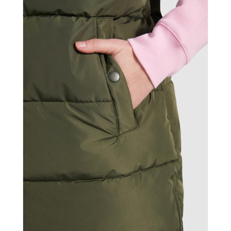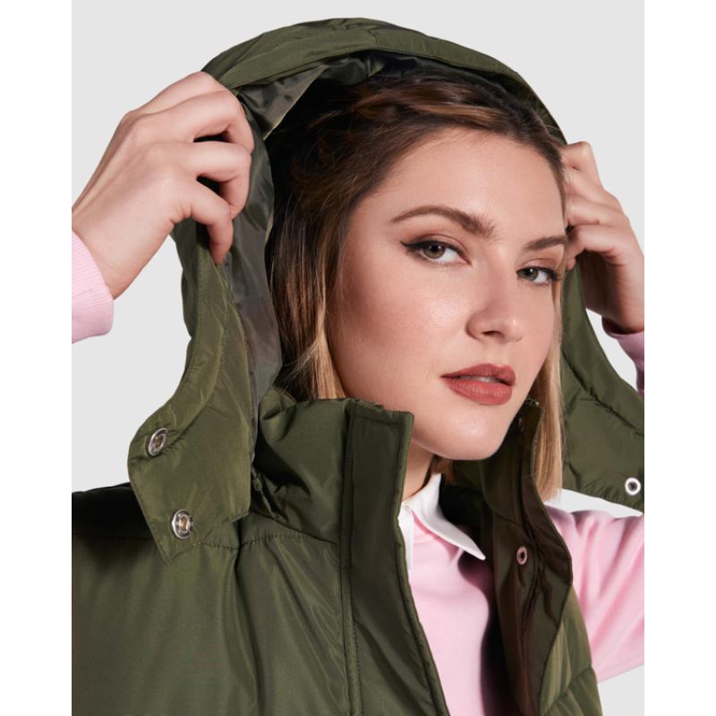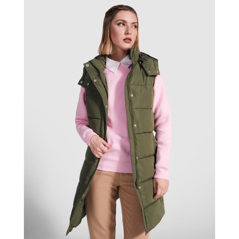 Chaleco acolchado de mujer con capucha extraíble. Cuello alto. Cierre frontal con cremallera oculta por solapa. Dos bolsillos con cierre de botón a presión. Aperturas laterales con cremalleras. Acceso interior en pecho para reprocesos.