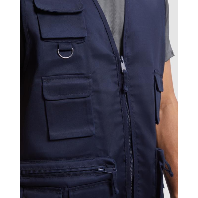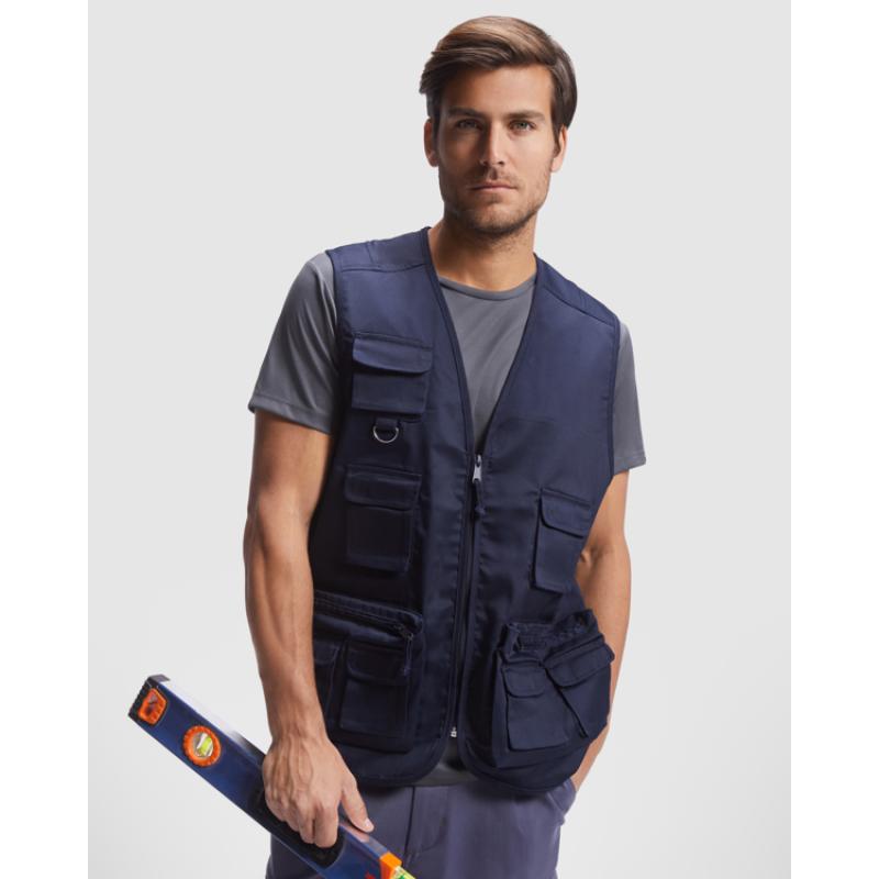 Chaleco laboral multibolsillos.· Cuello en pico.· Cremallera frontal con tirador.· Bolsillo superior derecho con argolla metálica.· Dos bolsillos con tapeta y cierre de velcro.· Dos bolsillos laterales con cremallera y superpuestos dos bolsillos con tapeta y cierre de velcro.· Dos bolsillos traseros con tapeta y cierre de velcro.· Bordes ribeteados con vivo del mismo tejido.· Etiquetado Roly WRK exterior.