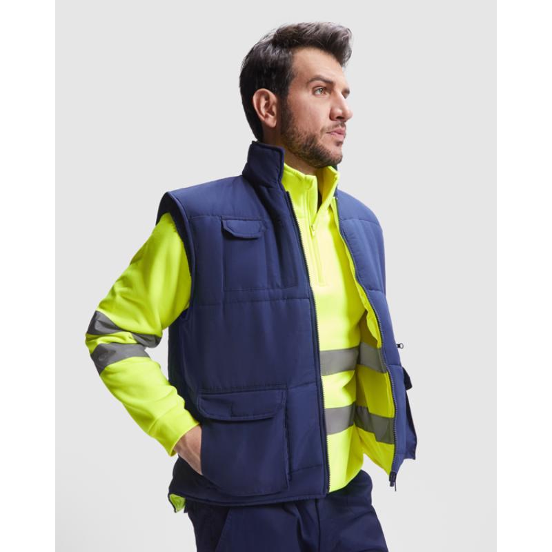 Chaleco alta visibilidad acolchado multibolsillos reversible con faldón trasero. ·Exterior en color azul marino. ·Interior en color amarillo flúor con cintas reflectantes. ·Dos bolsillos frontales de doble acceso, lateral y superior de fuelle con tapeta. ·Bolsillo en pecho multiusos. ·Cremallera frontal con tirador reversible. ·Sisas ajustables con elástico. ·Piezas engomadas en la cintura. ·Faldón en la parte trasera. ·Etiquetado Roly WRK exterior.·Ciclos de lavado: x25