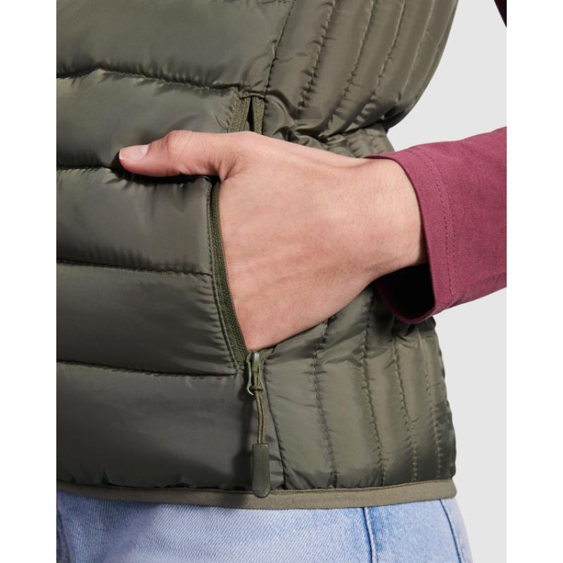 Chaleco acolchado resistente al agua. Cremallera frontal invertida al tono con protector de barbilla del mismo tejido. Bolsillos laterales con cremalleras invertidas al tono insertado en los paneles laterales con forma en pecho para mejor ajuste. Vivo elástico al tono en sisas y bajo. Opción de colores lisos o a contraste en interior.