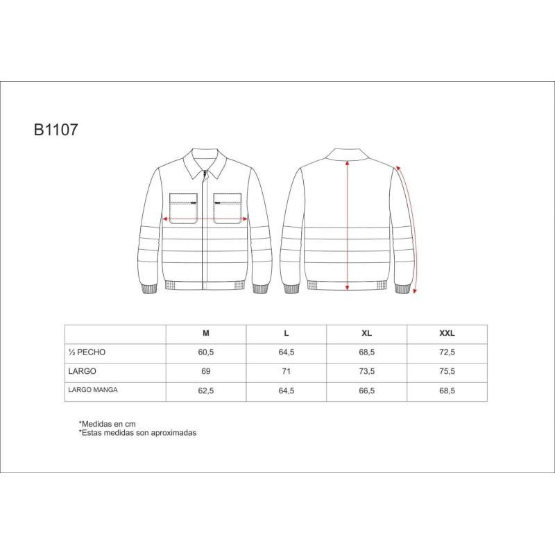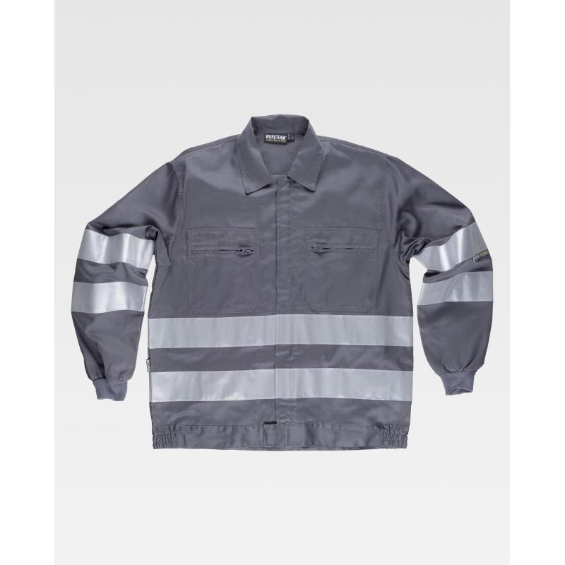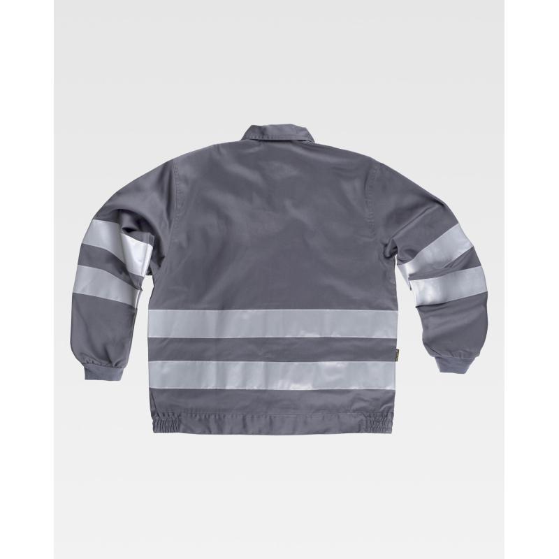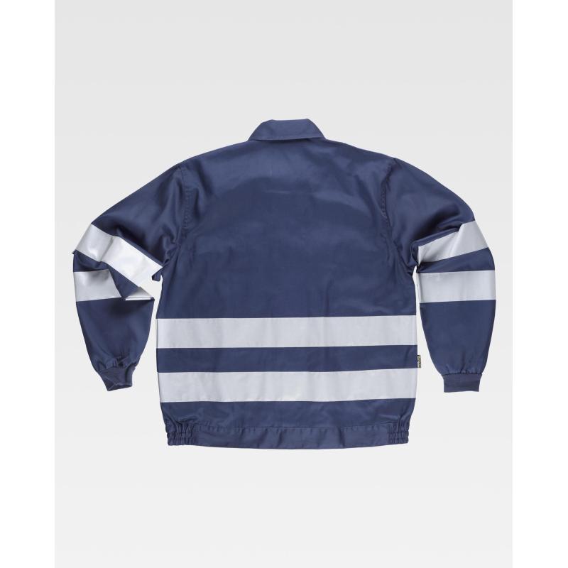 Cazadora con cintas reflectantes. Cuello camisero y cierre de cremallera de nylon oculta. Dos bolsos de pecho de plastón con cierre de cremallera de nylon. Dos cintas reflectantes en pecho, espalda y mangas. Puño elástico. Cierre de velcro en cintura y elástico en los laterales. 65% Poliéster 35% Algodón