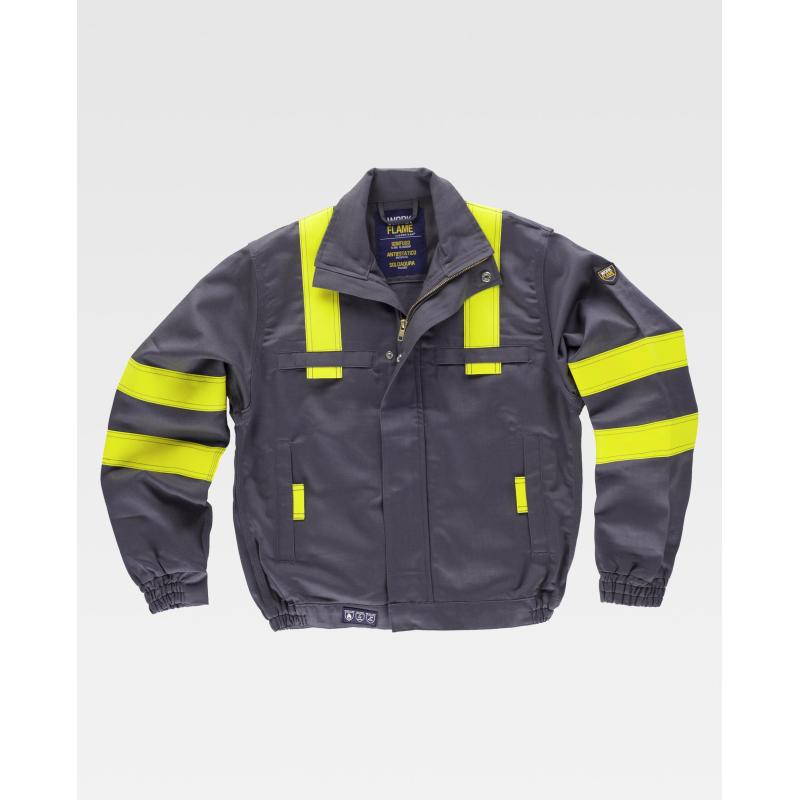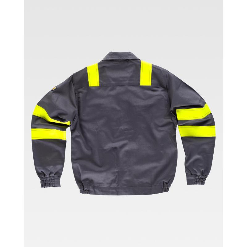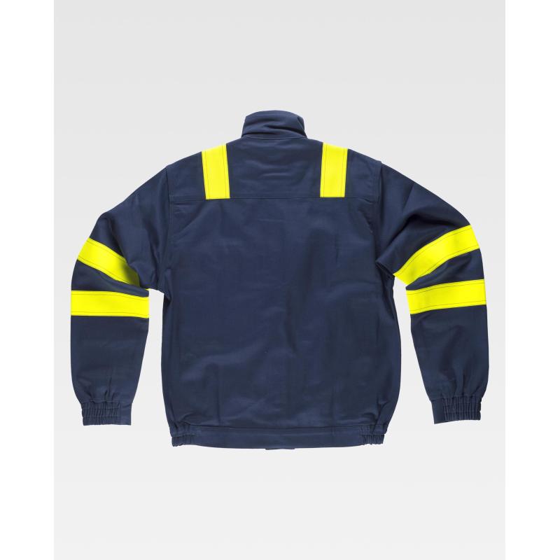 Cazadora para soldador, ignífuga y antiestática de triple costura. Cuello alto y cierre de cremallera de metal y corchetes ocultos por solapa postiza. Dos bolsos de pecho y dos bolsos laterales, todos de ojal con solapas de seguridad y cierre de corchete. Una cinta fluorescente amarilla ignífuga en hombros y dos en mangas. Puño con elástico. Canesú en espalda. Elástico en los laterales de la cintura. 87% Algodón 12% Nylon 1% Fibra Antiestática