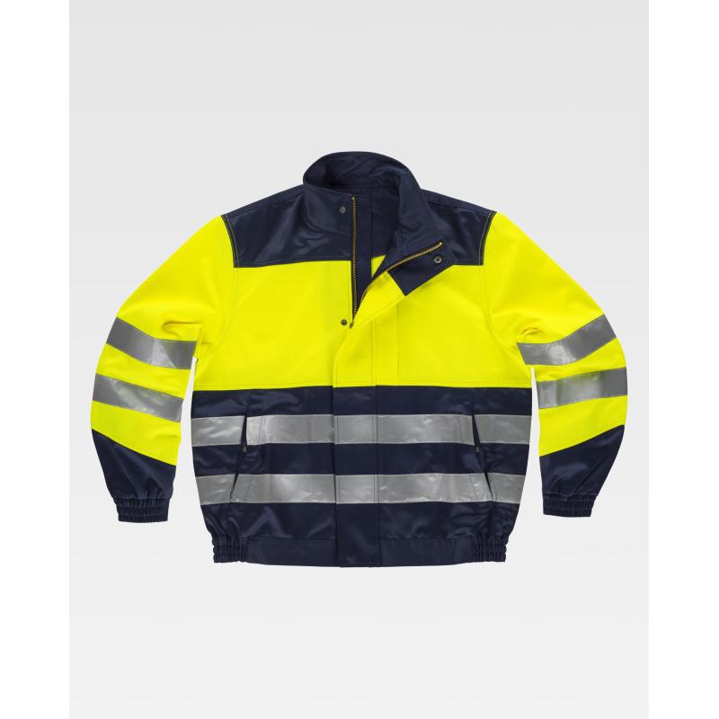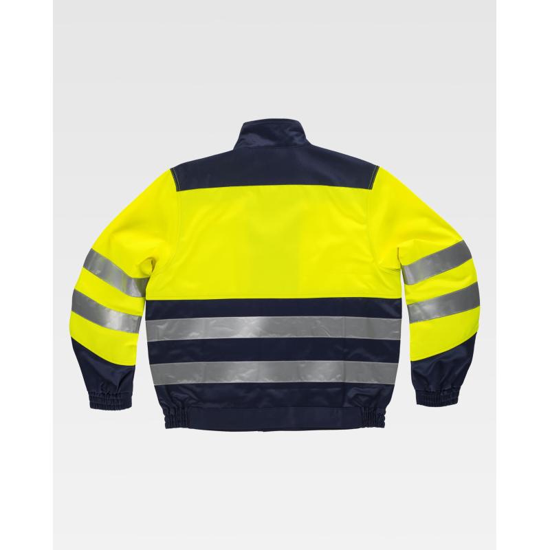 Cazadora antiestática y contra productos químicos, de alta visibilidad con cintas reflectantes. Cuello alto y cierre de cremallera de metal y corchetes ocultos por solapa postiza. Un bolso de pecho con cierre de cremallera metálica oculta y dos bolsos laterales con cierre de corchete oculto. Dos cintas reflectantes en pecho, espalda y mangas. Puño con elástico. Elástico en los laterales de la cintura. 64% Poliéster 34% Algodón 1% Fibra Antiestática