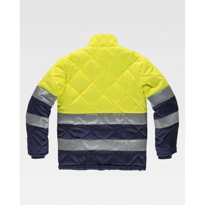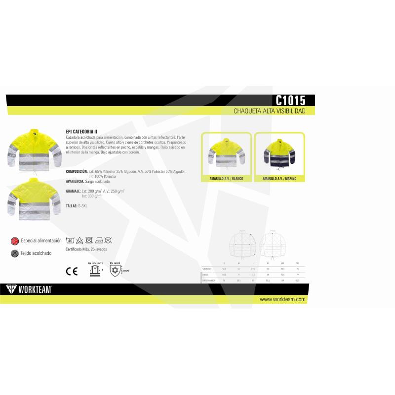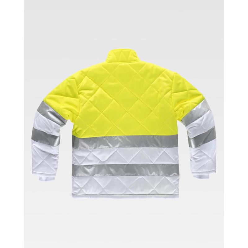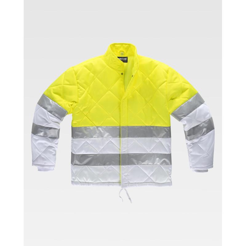 Cazadora acolchada para alimentación, combinada con cintas reflectantes. Parte superior de alta visibilidad. Cuello alto y cierre de corchetes ocultos. Pespunteado a rombos. Dos cintas reflectantes en pecho, espalda y mangas. Puño elástico en el interior de la manga. Bajo ajustable con cordón. 65% Poliéster 35% Algodón. A.V. 50% Poliéster 50% Algodón. Interior: 100% Poliéster