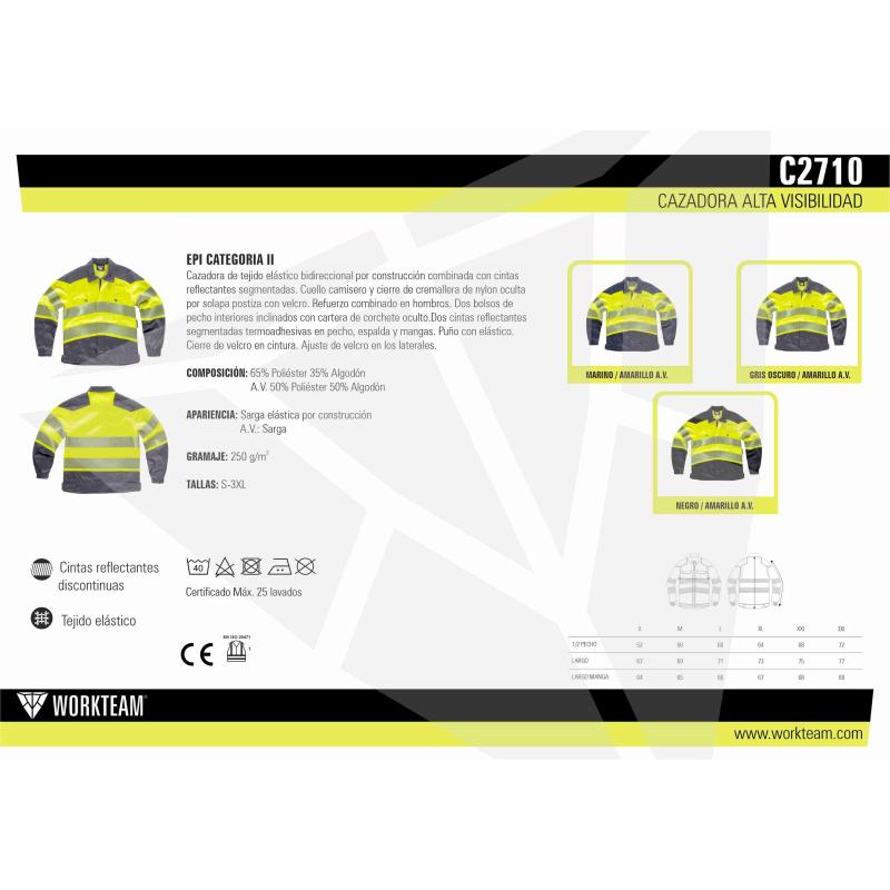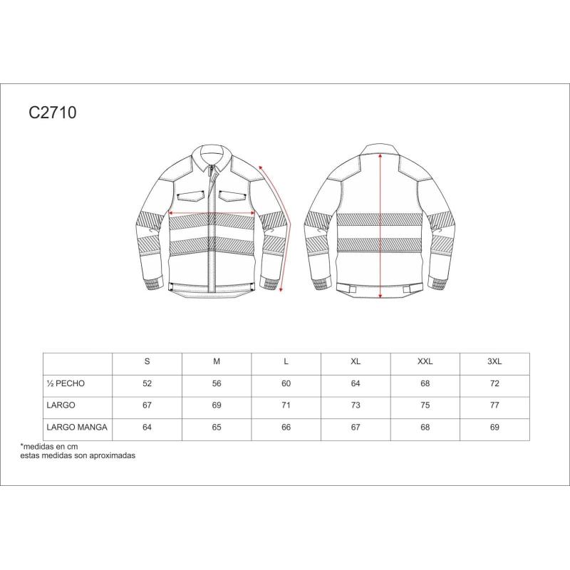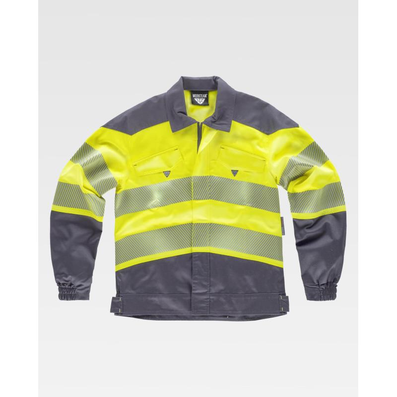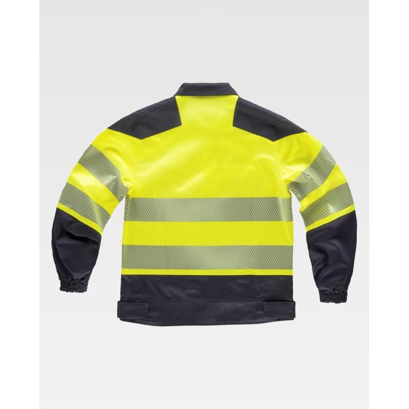 Cazadora de tejido elástico bidireccional por construcción combinada con cintas reflectantes segmentadas. Cuello camisero y cierre de cremallera de nylon oculta por solapa postiza con velcro. Refuerzo combinado en hombros. Dos bolsos de pecho interiores inclinados con cartera de corchete oculto.Dos cintas reflectantes segmentadas termoadhesivas en pecho, espalda y mangas. Puño con elástico. Cierre de velcro en cintura. Ajuste de velcro en los laterales. Prin. 65% Poliéster 35% Algodón / A.V. 50% Poliéster 50% Algodón