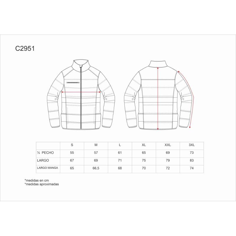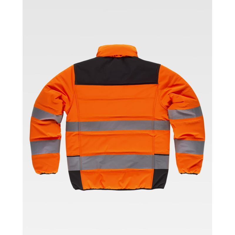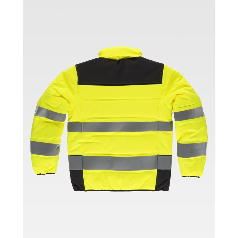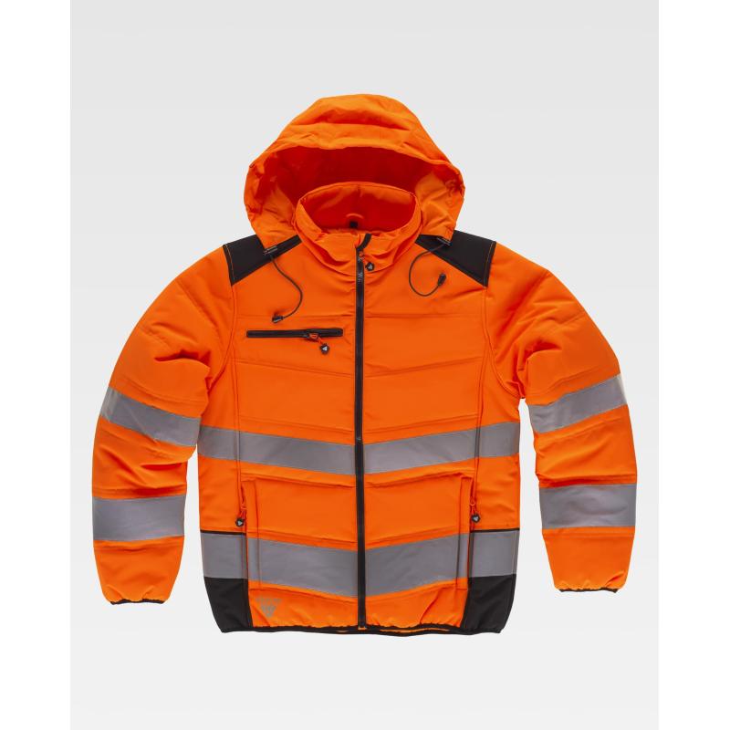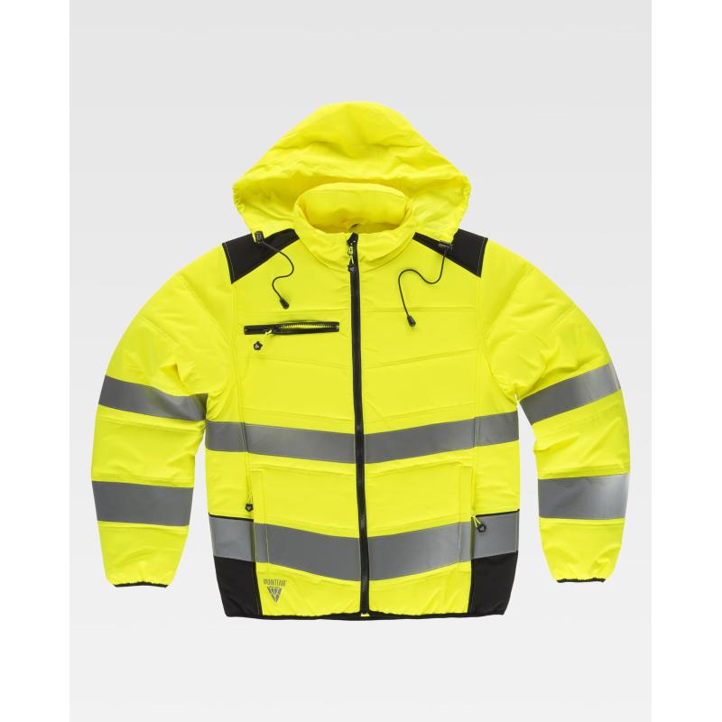 Cazadora acolchada combinada con alta visibilidad y cintas reflectantes. Cuello alto y capucha enrollable con cordón para ajustar. Cierre de cremallera. Solapa protectora interior vuelta en la parte superior cubriendo la cremallera. Dos bolsos laterales interiores con cierre de cremallera. Un bolso de pecho interior con cierre de cremallera. Dos cintas reflectantes de distinto tamaño en pecho, espalda y mangas. Puños y bajo ribeteados con bies elástico a contraste. 100% Poliéster