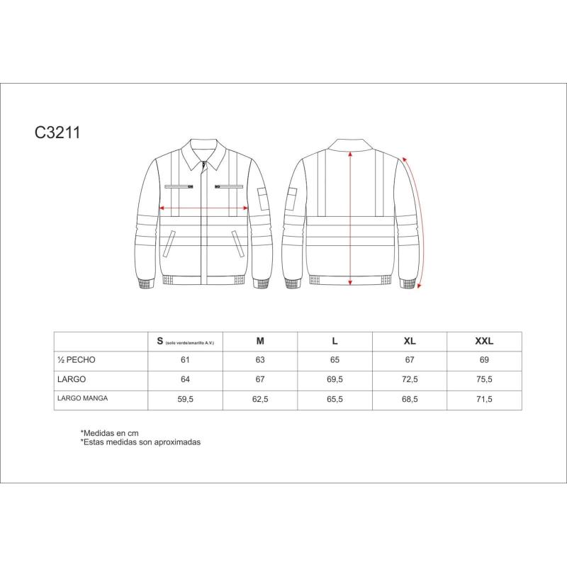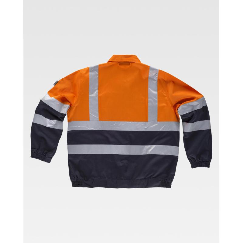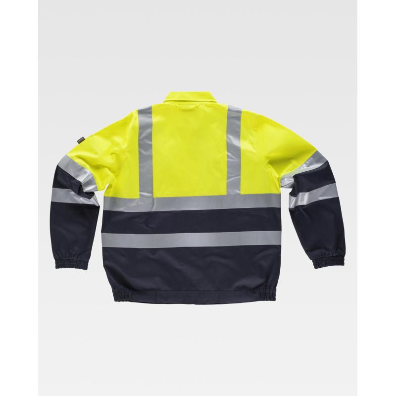 Cazadora combinada con cintas reflectantes. Parte superior de alta visibilidad. Cuello camisero y cierre de cremallera de nylon oculta por solapa postiza con velcro. Dos bolsos de pecho interiores con cierre de cremallera de nylon y dos bolsos laterales de ojal con cierre de corchete. Un bolsillo en la manga con cartera y velcro. Una cinta reflectante en hombros y dos en pecho, espalda y mangas. Puño con elástico. Cierre de velcro en cintura y elástico en los laterales. Prin. 65% Poliéster 35% Algodón / A.V. 50% Poliéster 50% Algodón