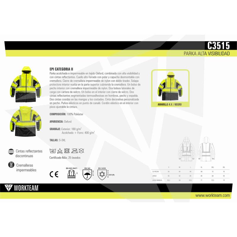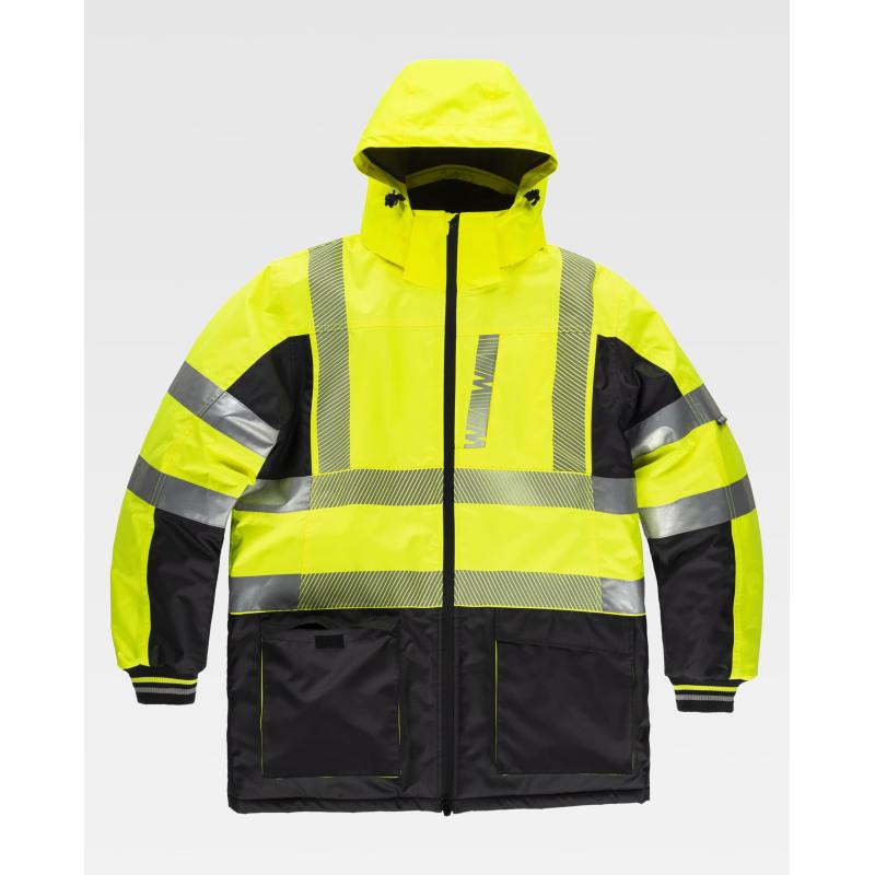Parka acolchada e impermeable en tejido Oxford, combinada con alta visibilidad y con cintas reflectantes. Cuello alto forrado con polar y capucha desmontable con cremallera. Cierre de cremallera impermeable de nylon con doble tirador. Solapa protectora interior vuelta en la parte superior cubriendo la cremallera. Un bolso de pecho interior con cremallera impermeable de nylon. Dos bolsos laterales de carga con cartera de velcro. Un bolso en el interior con cierre de velcro. Dos cintas reflectantes segmentadas termoadhesivas en hombros, pecho y espalda. Dos cintas cosidas en las mangas y los costados. Cinta decorativa personalizada en pecho. Puños elásticos en punto de canalé. Cordón elástico en el interior con pieza ajustable la cintura. 100% Poliéster