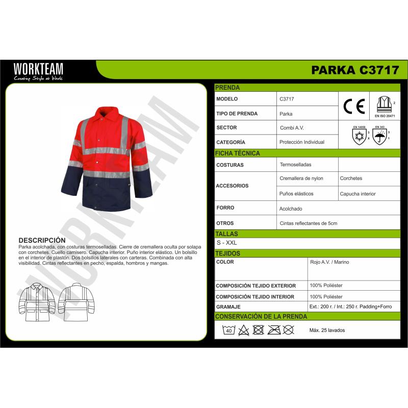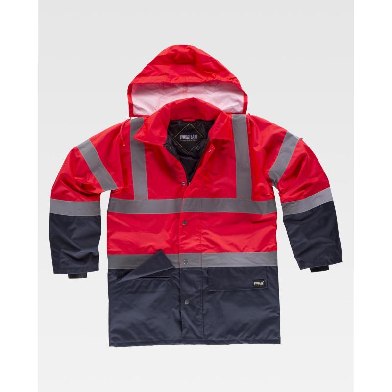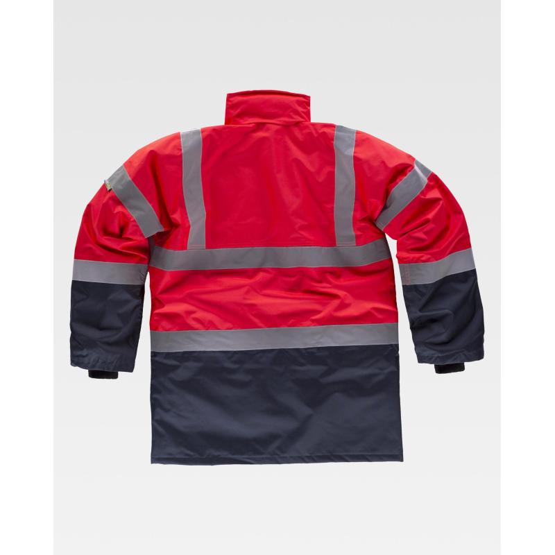 Parka acolchada e impermeable en tejido Oxford, combinada y con cintas reflectantes. Parte superior de alta visibilidad. Cuello camisero y capucha interior ajustable con cordón. Cierre de cremallera de doble tirador oculta por solapa postiza con corchetes. Dos bolsos laterales de ojal con cartera. Un bolso de pecho de plastón en el interior. Una cinta reflectante en hombros y dos en pecho, espalda y mangas. Puño elástico en el interior de la manga. 100% Poliéster