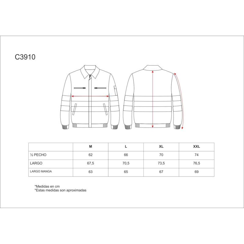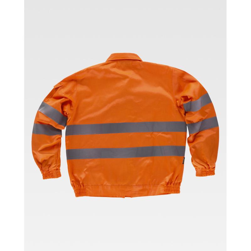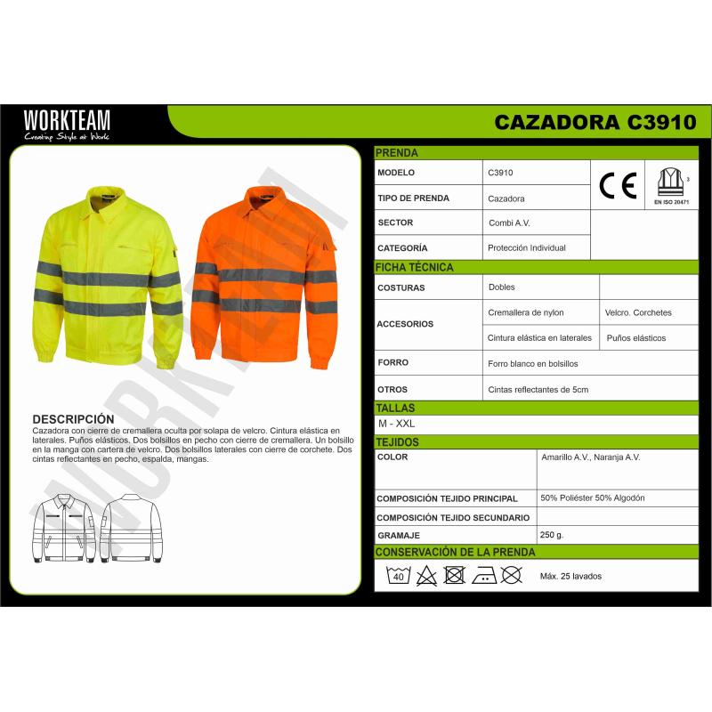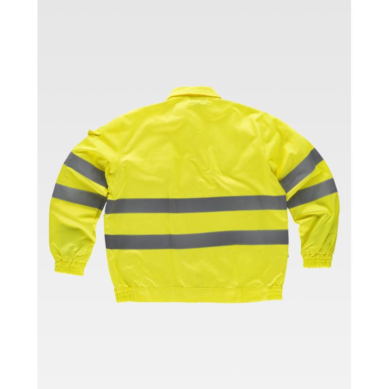 Cazadora de alta visibilidad con cintas reflectantes. Cuello camisero y cierre de cremallera de nylon oculta por solapa postiza con velcro. Dos bolsos de pecho interiores con cierre de cremallera de nylon y dos bolsos laterales de ojal con cierre de corchete. Un bolsillo en la manga con cartera y velcro. Dos cintas reflectantes en pecho, espalda y mangas. Puño con elástico. Cierre de velcro en cintura y elástico en los laterales. 50% Poliéster 50% Algodón