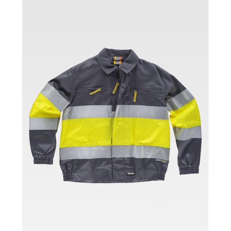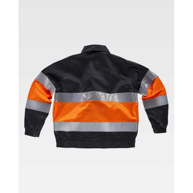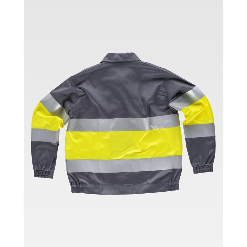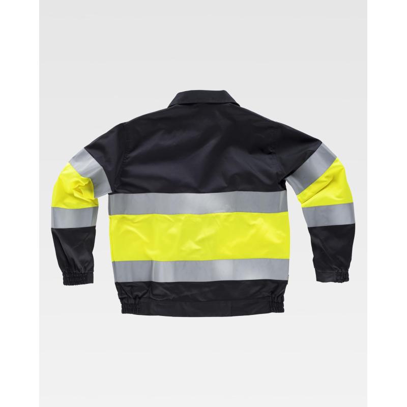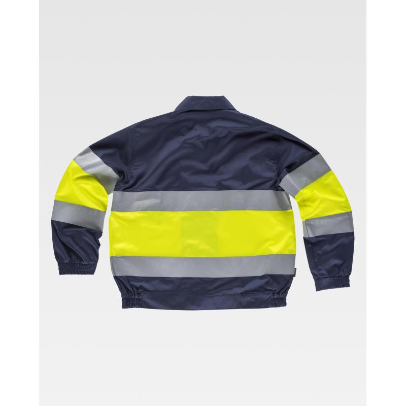 Cazadora combinada con alta visibilidad y cintas reflectantes. Cuello camisero y cierre de cremallera de nylon oculta por solapa postiza con velcro. Dos bolsos de pecho interiores con cierre de cremallera de nylon. Dos cintas reflectantes en pecho, espalda y mangas con pieza central de alta visibilidad. Puño con elástico. Cierre de velcro en cintura y elástico en los laterales. Prin. 65% Poliéster 35% Algodón / A.V. 50% Poliéster 50% Algodón