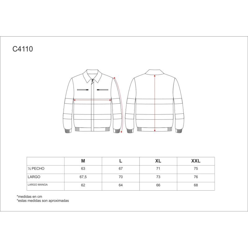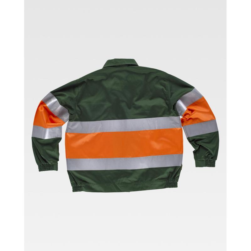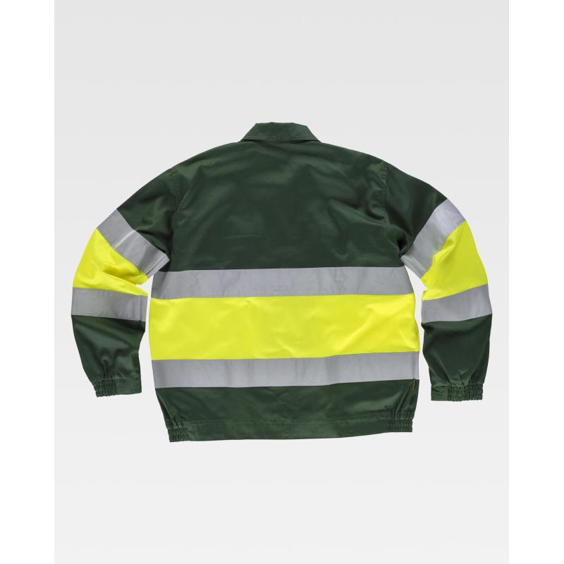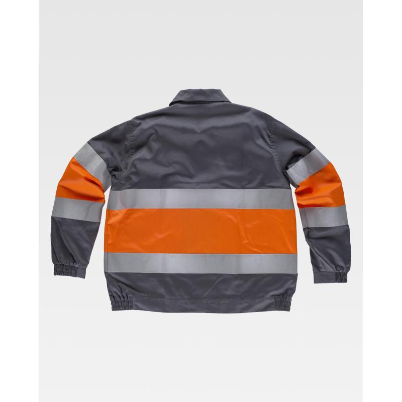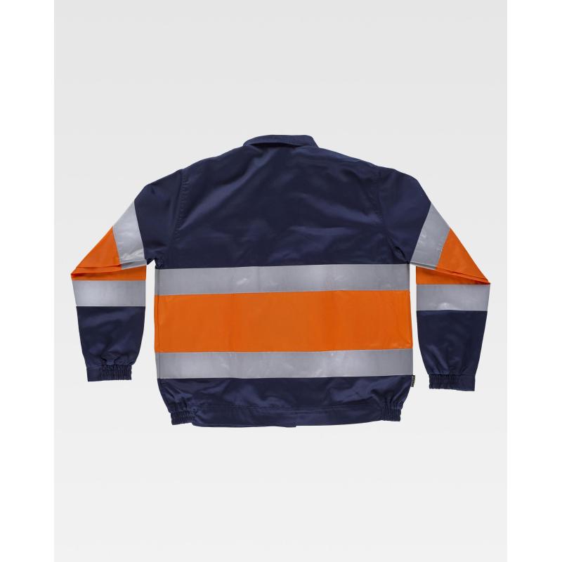 Cazadora combinada con alta visibilidad y cintas reflectantes. Cuello camisero y cierre de cremallera de nylon oculta por solapa postiza con velcro. Dos bolsos de pecho interiores con cierre de cremallera de nylon. Dos cintas reflectantes en pecho, espalda y mangas con pieza central de alta visibilidad. Puño con elástico. Cierre de velcro en cintura y elástico en los laterales. Prin. 65% Poliéster 35% Algodón / A.V. 50% Poliéster 50% Algodón