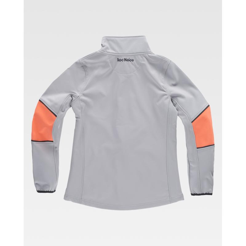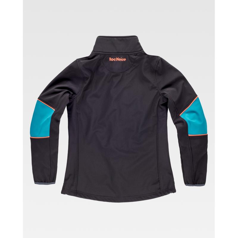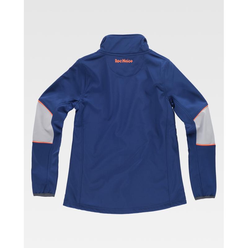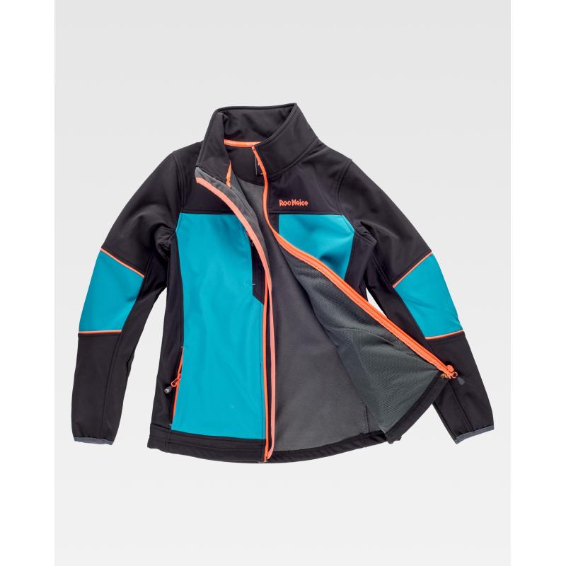 Softshell de mujer combinada tricolor. Cuello alto con cinta personalizada cubrecosturas en el interior. Cierre de cremallera y protector de barbilla. Vista completa cubre cremallera en el interior. Bajo con elástico ajustable. Bies elástico en puños. Dos bolsillos laterales y uno en pecho, todos ellos con cierre de cremallera. Logos bordados en pecho y espalda. Interior polar forrado con rejilla en la parte delantera. El revestimiento técnico impide que el agua penetre, a la vez que permite la transpiración. Ajuste en bajo y puños para aumentar la protección. 96% Poliéster 4% Elastano