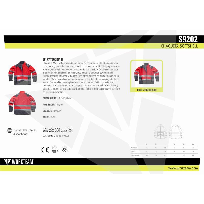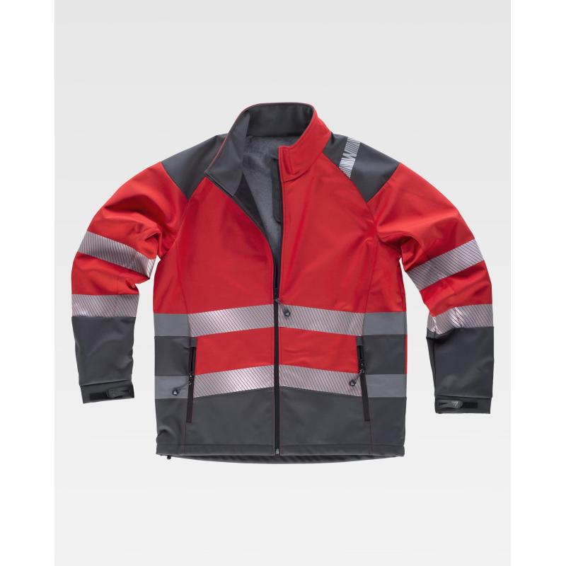 Workshell combinada con cintas reflectantes. Cuello alto con interior combinado y cierre de cremallera de nylon de cierre invertido. Solapa protectora interior vuelta en la parte superior cubriendo la cremallera. Dos bolsos laterales interiores con cremalleras de nylon. Dos cintas reflectantes segmentadas termoadhesivas en pecho y mangas. Dos cintas cosidas en los costados y en la espalda. Cinta decorativa personalizada en un hombro. Bocamanga ajustable con velcro. Cordón elástico con pieza ajustable en el bajo. Tejido corta vientos, repelente al agua y resistente al desgarro con membrana interior transpirable y aislante e interior de alta capacidad térmica. Tejido interior super suave, con forro de rejilla en delantero. 100% Poliéster