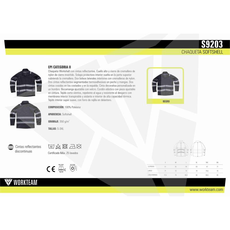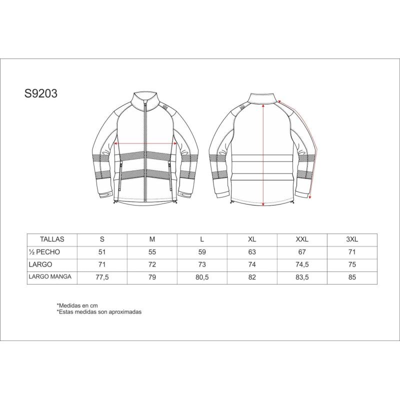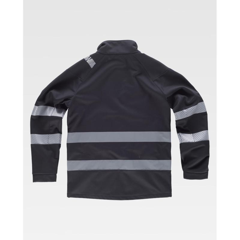 Chaqueta Workshell con cintas reflectantes. Cuello alto y cierre de cremallera de nylon de cierre invertido. Solapa protectora interior vuelta en la parte superior cubriendo la cremallera. Dos bolsos laterales interiores con cremalleras de nylon. Dos cintas reflectantes segmentadas termoadhesivas en pecho y mangas. Dos cintas cosidas en los costados y en la espalda. Cinta decorativa personalizada en un hombro. Bocamanga ajustable con velcro. Cordón elástico con pieza ajustable en el bajo. Tejido corta vientos, repelente al agua y resistente al desgarro con membrana interior transpirable y aislante e interior de alta capacidad térmica. Tejido interior super suave, con forro de rejilla en delantero. 100% Poliéster