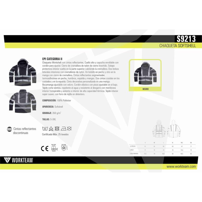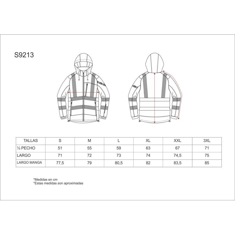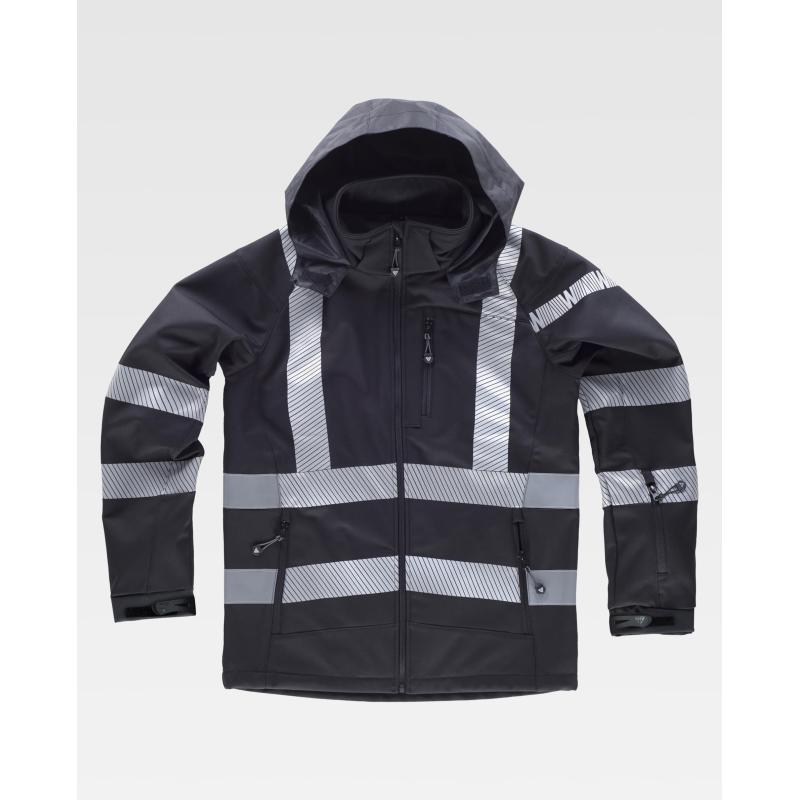 Workshell combinada con cintas reflectantes. Cuello alto y capucha enrollable con cordón para ajustar. Cierre de cremallera de nylon de cierre invertido. Solapa protectora interior vuelta en la parte superior cubriendo la cremallera. Dos bolsos laterales interiores con cremalleras de nylon. Un bolsillo en pecho y otro en la manga con cierre de cremallera. Cintas reflectantes segmentadas termoadhesivas en pecho, hombros, espalda y mangas. Dos cintas cosidas en los costados y en la espalda. Cinta decorativa personalizada en una manga. Bocamanga ajustable con velcro. Cordón elástico con pieza ajustable en el bajo. Tejido corta vientos, repelente al agua y resistente al desgarro con membrana interior transpirable y aislante e interior de alta capacidad térmica. Tejido interior super suave, con forro de rejilla en delantero. 100% Poliéster